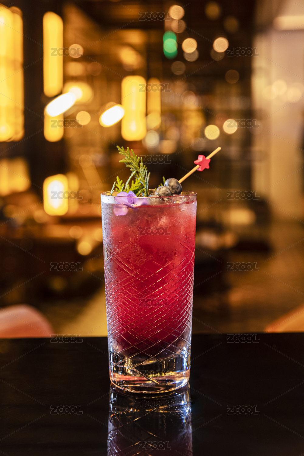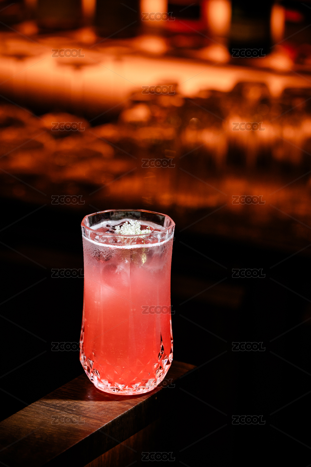 一杯鸡尾酒放在琳琅满目的酒柜前的吧台上