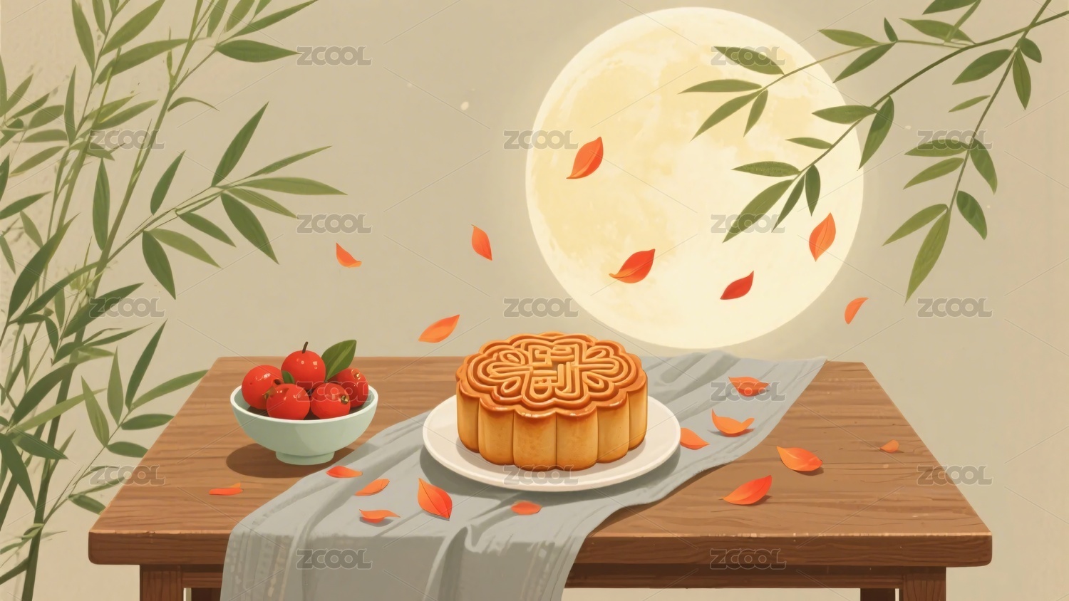 中秋月下的月饼与鲜果插画