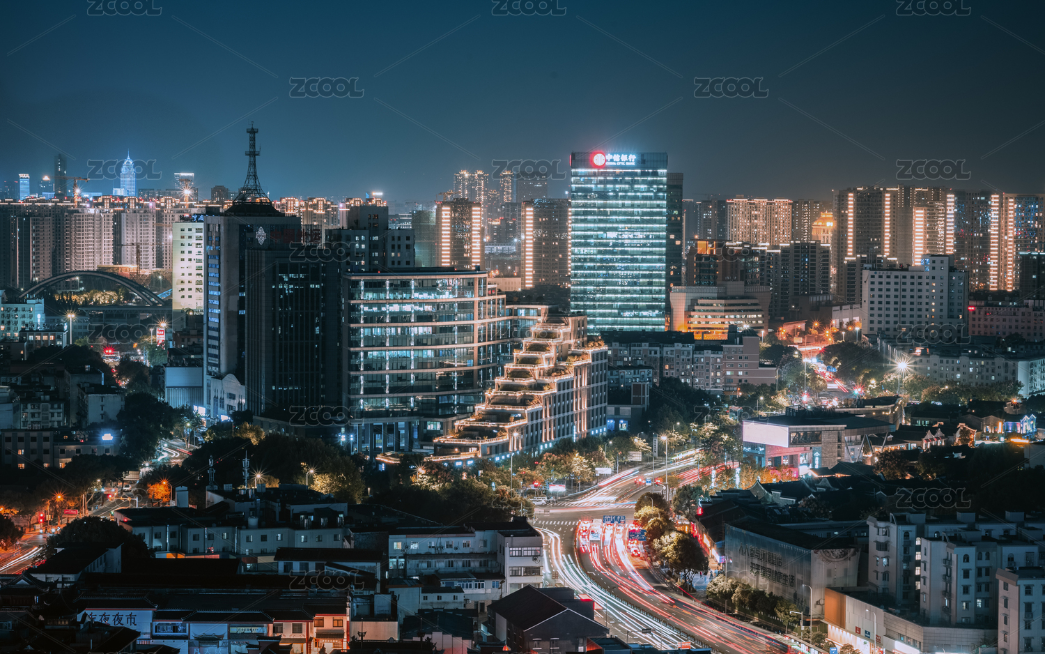 灯火璀璨的杭州城市建筑夜景