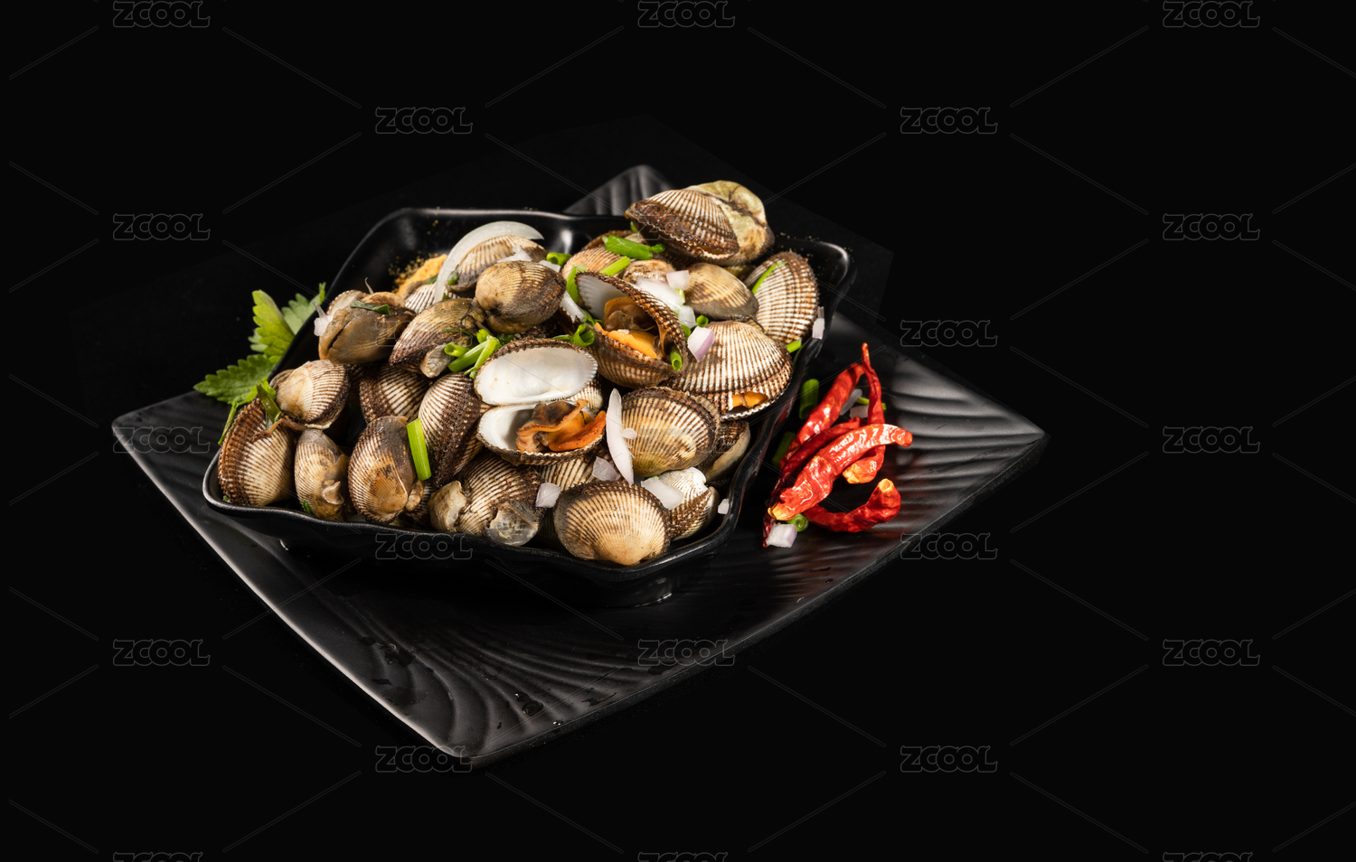 放在纯黑背景下的清蒸毛蚶