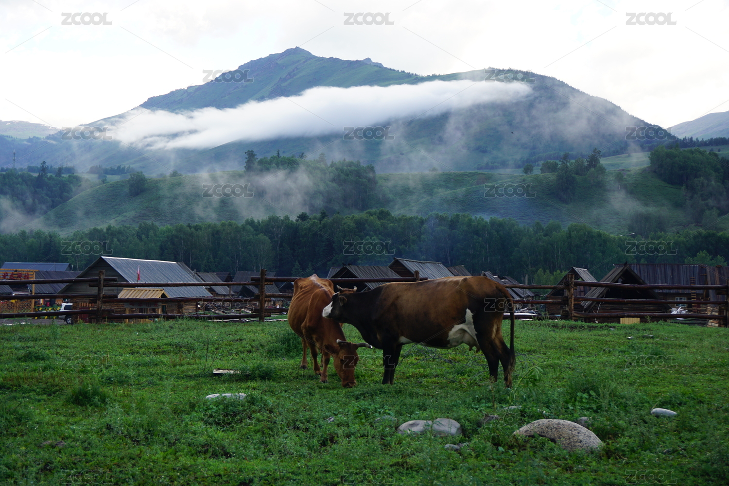 中国新疆喀纳斯景区夏季禾木村中吃草的牲畜