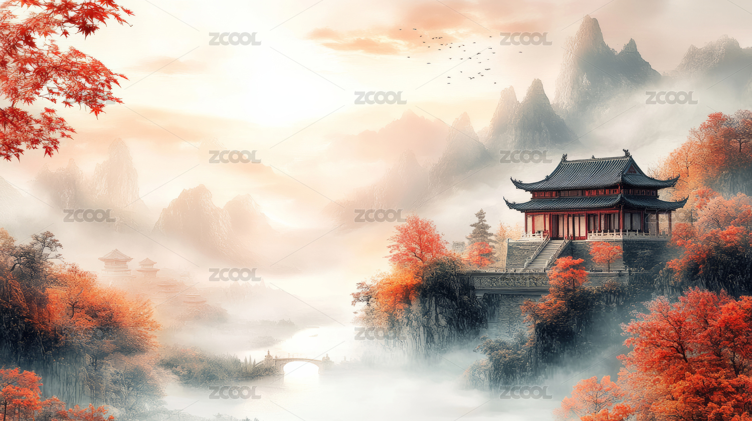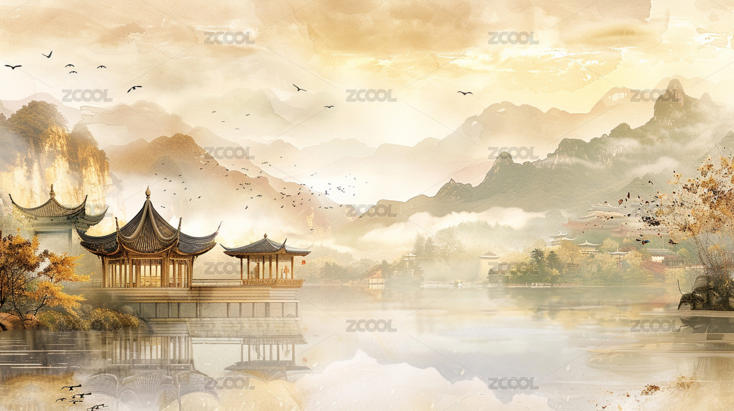 中国,山水,绘画,色彩,山,河流,松树,树,山坡,云