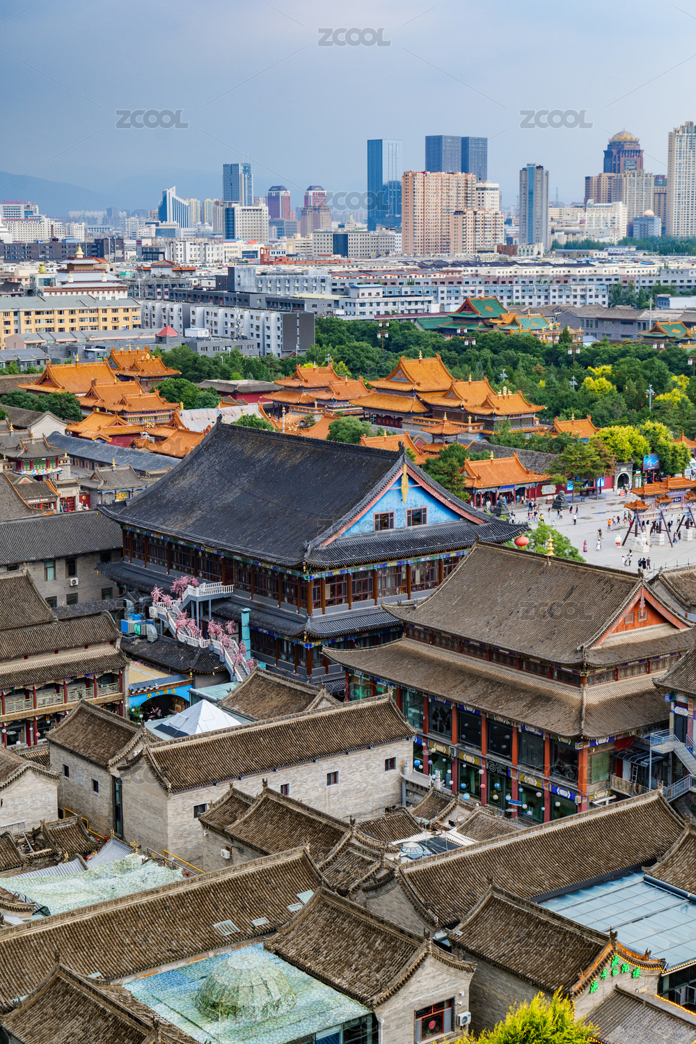 中国内蒙古呼和浩特大召无量寺与城市天际线