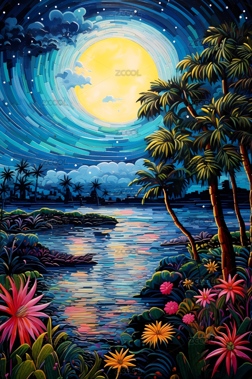月亮,植物,花,湖边,云,风景,海报,几何,抽象,艺术