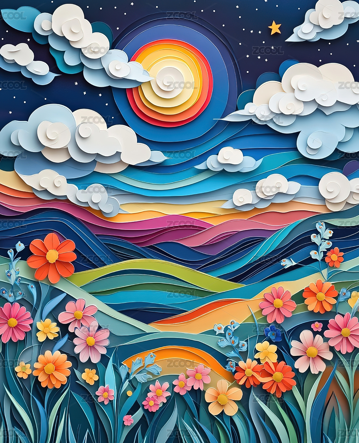 数码鲜花大海插画海报背景