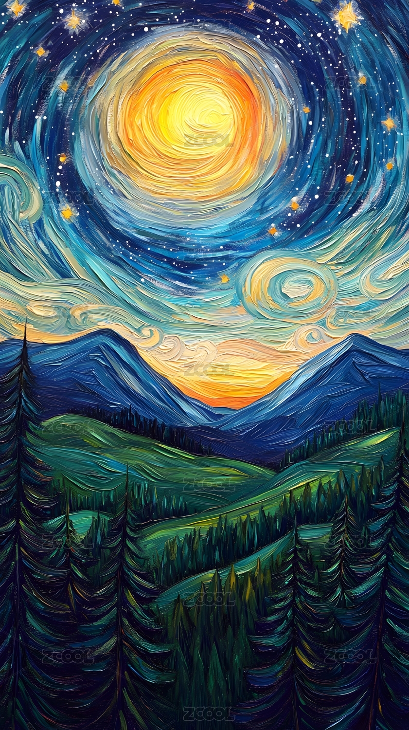 手绘卡通唯美的印象派艺术感黄昏户外风景插