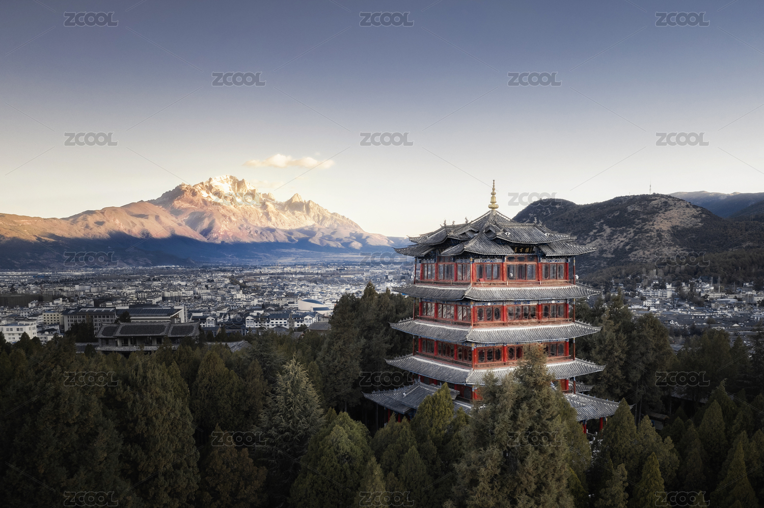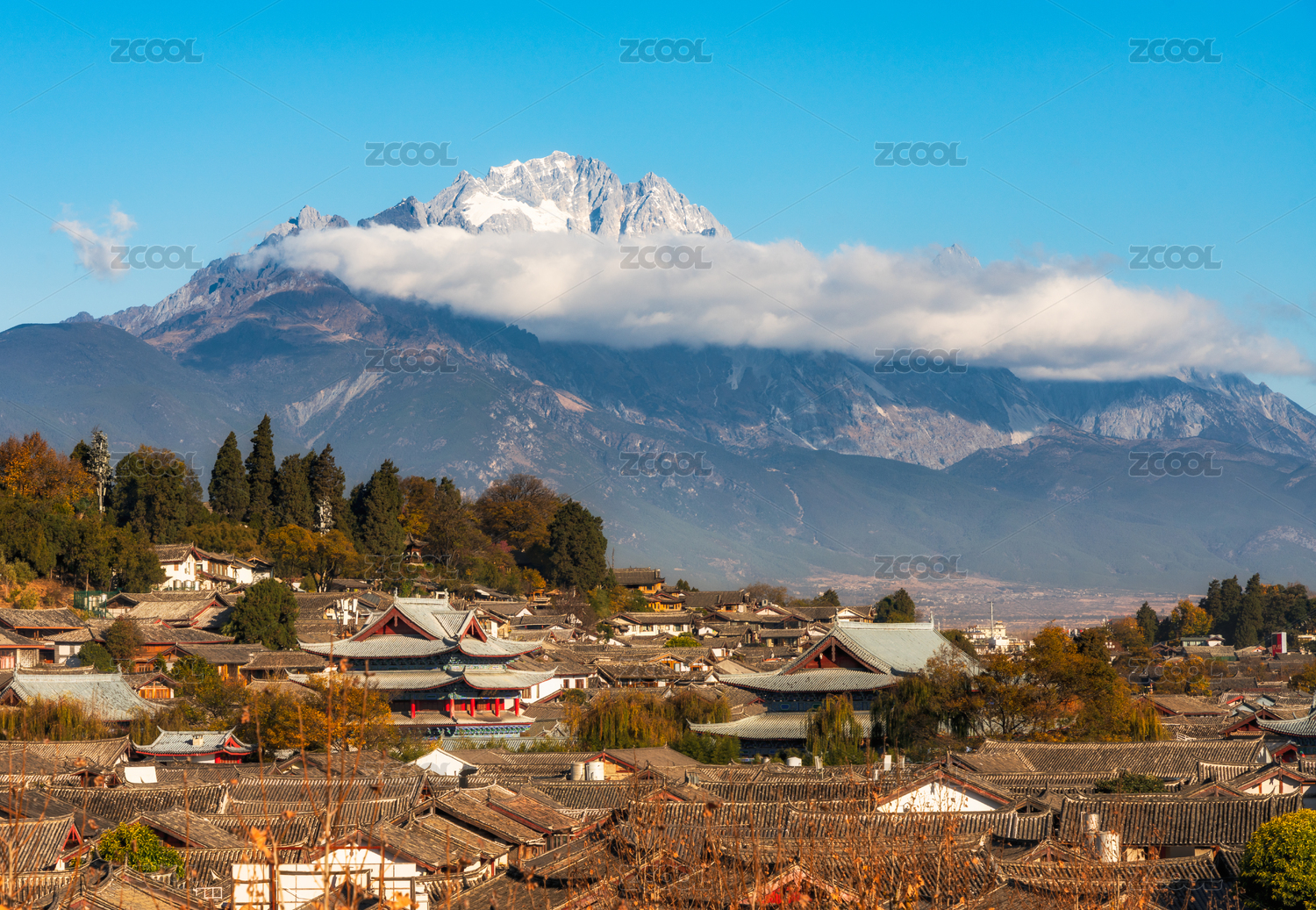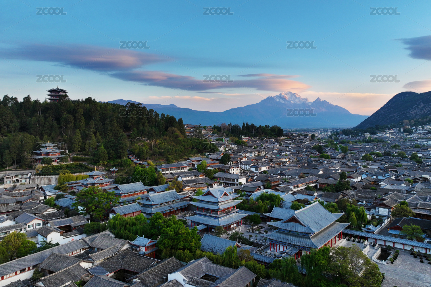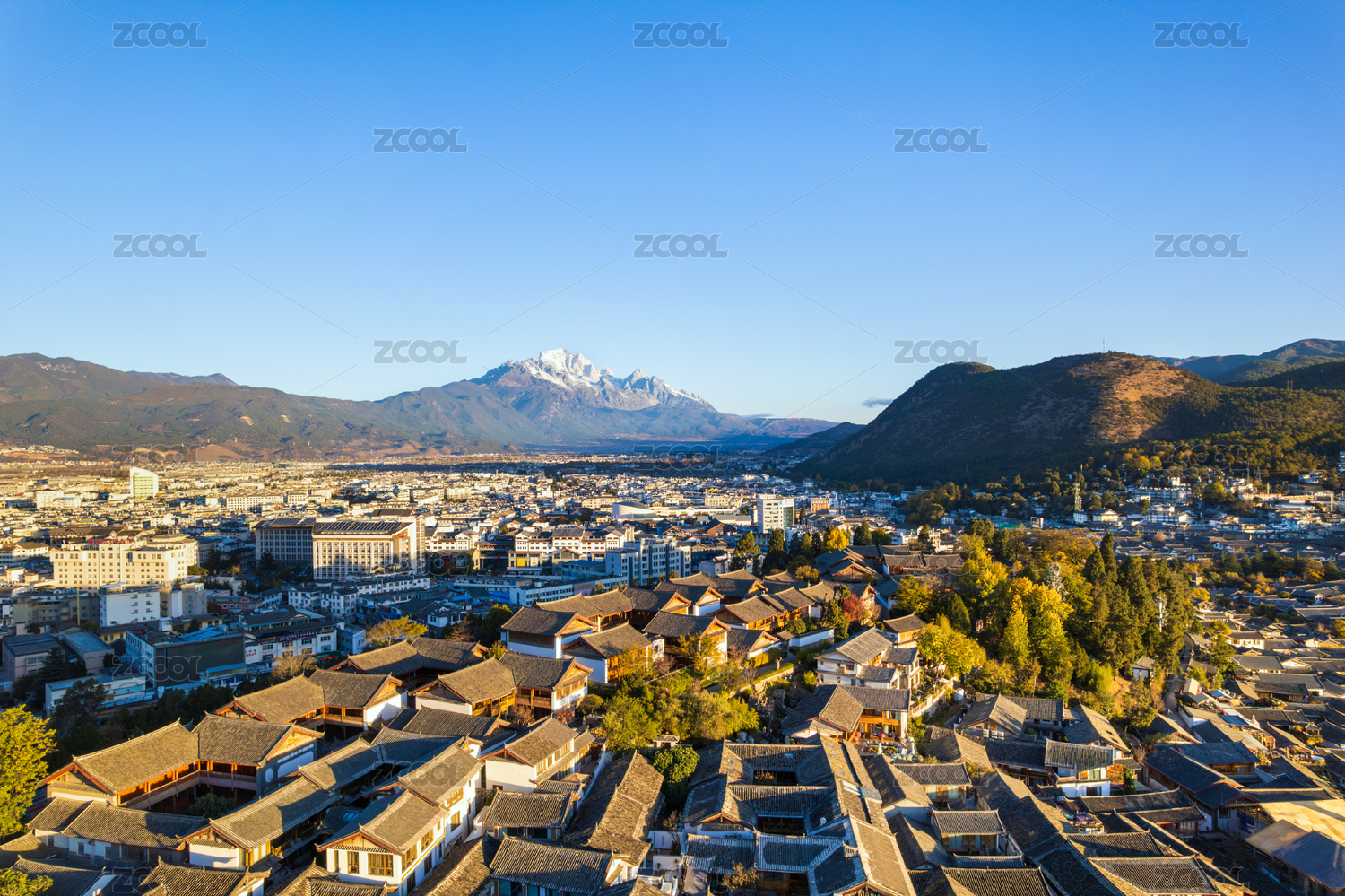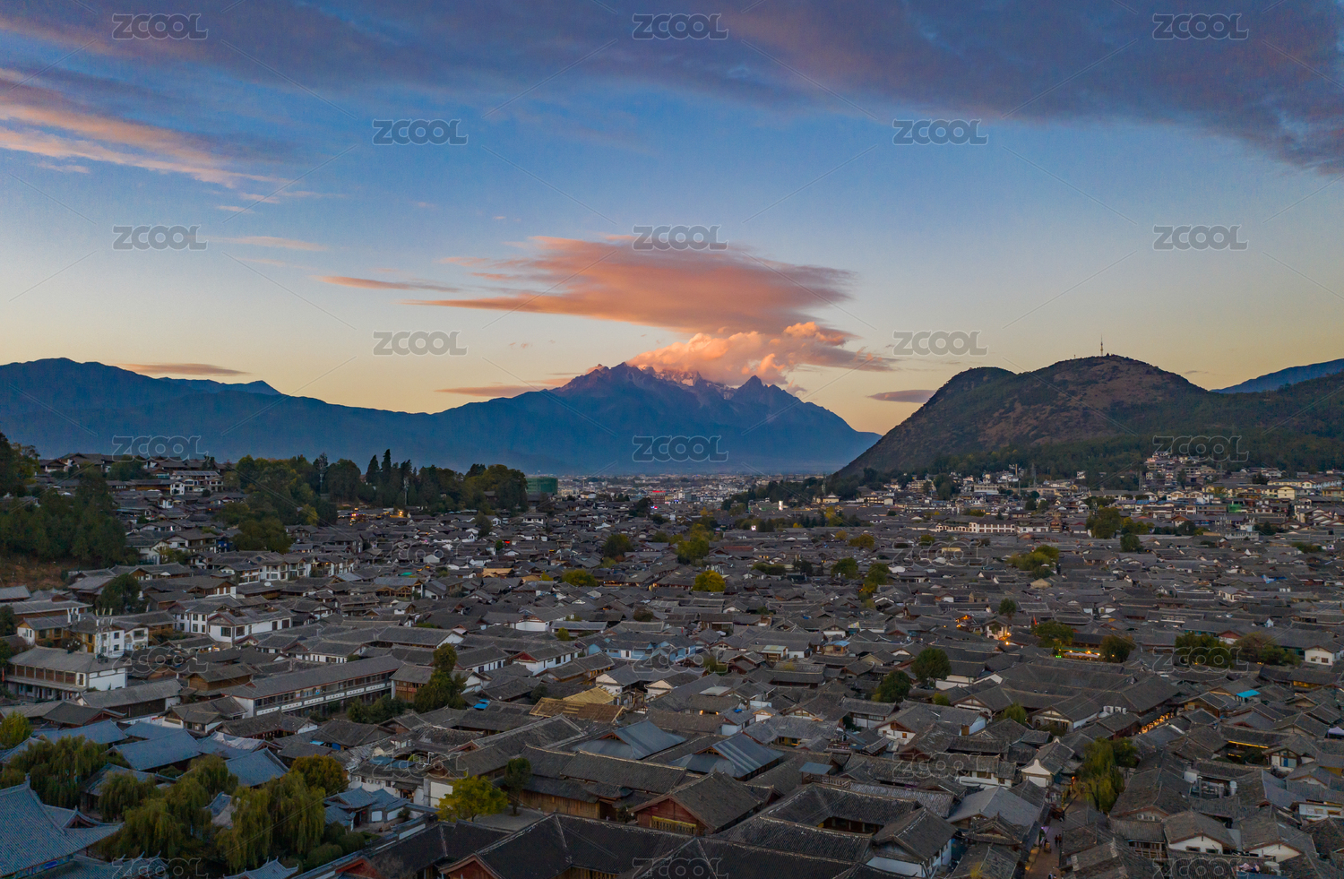 云南丽江古城密集的房屋和玉龙雪山日出清晨