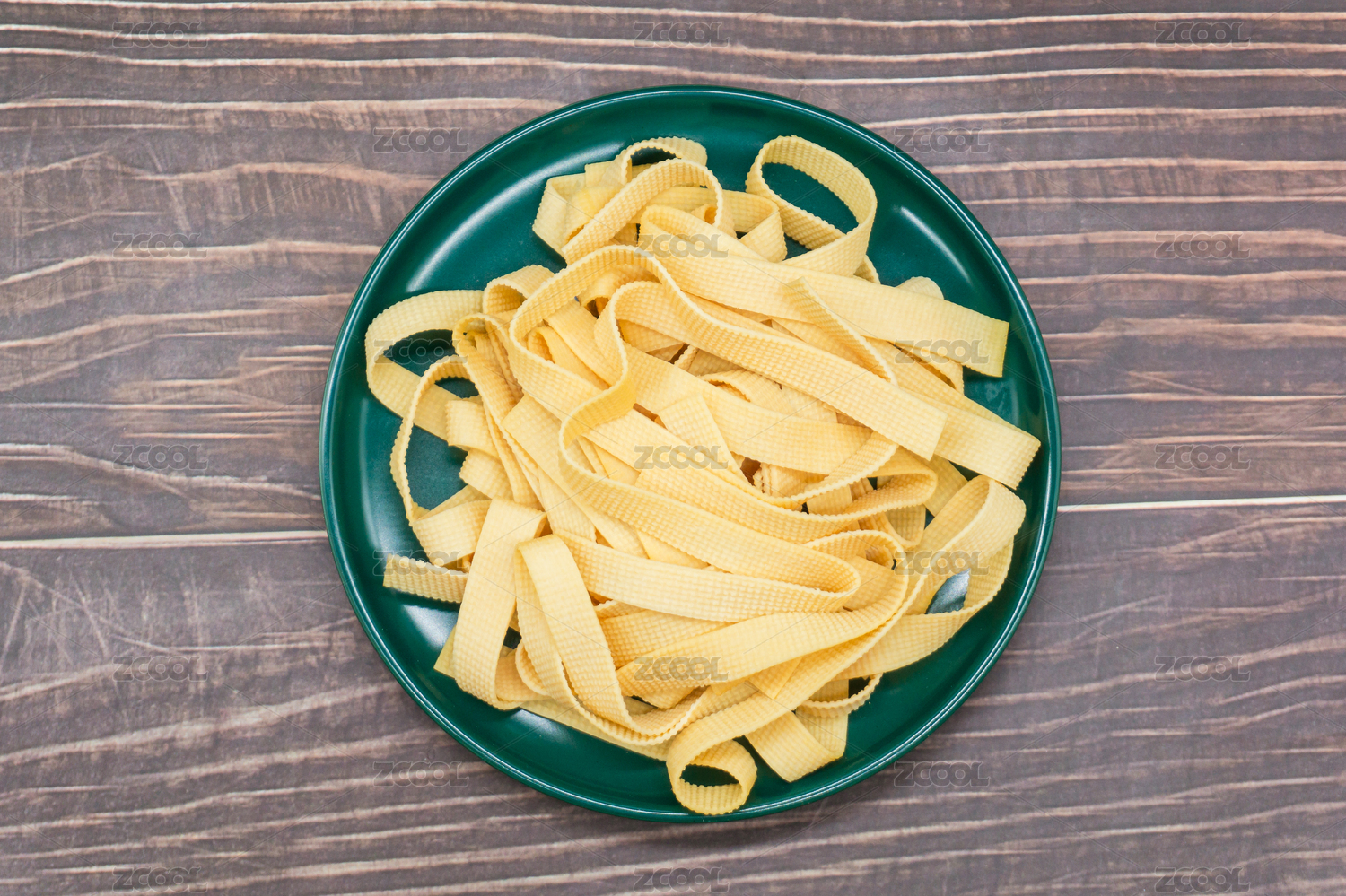 木质桌面上摆放着一盘子中餐美食手擀面条