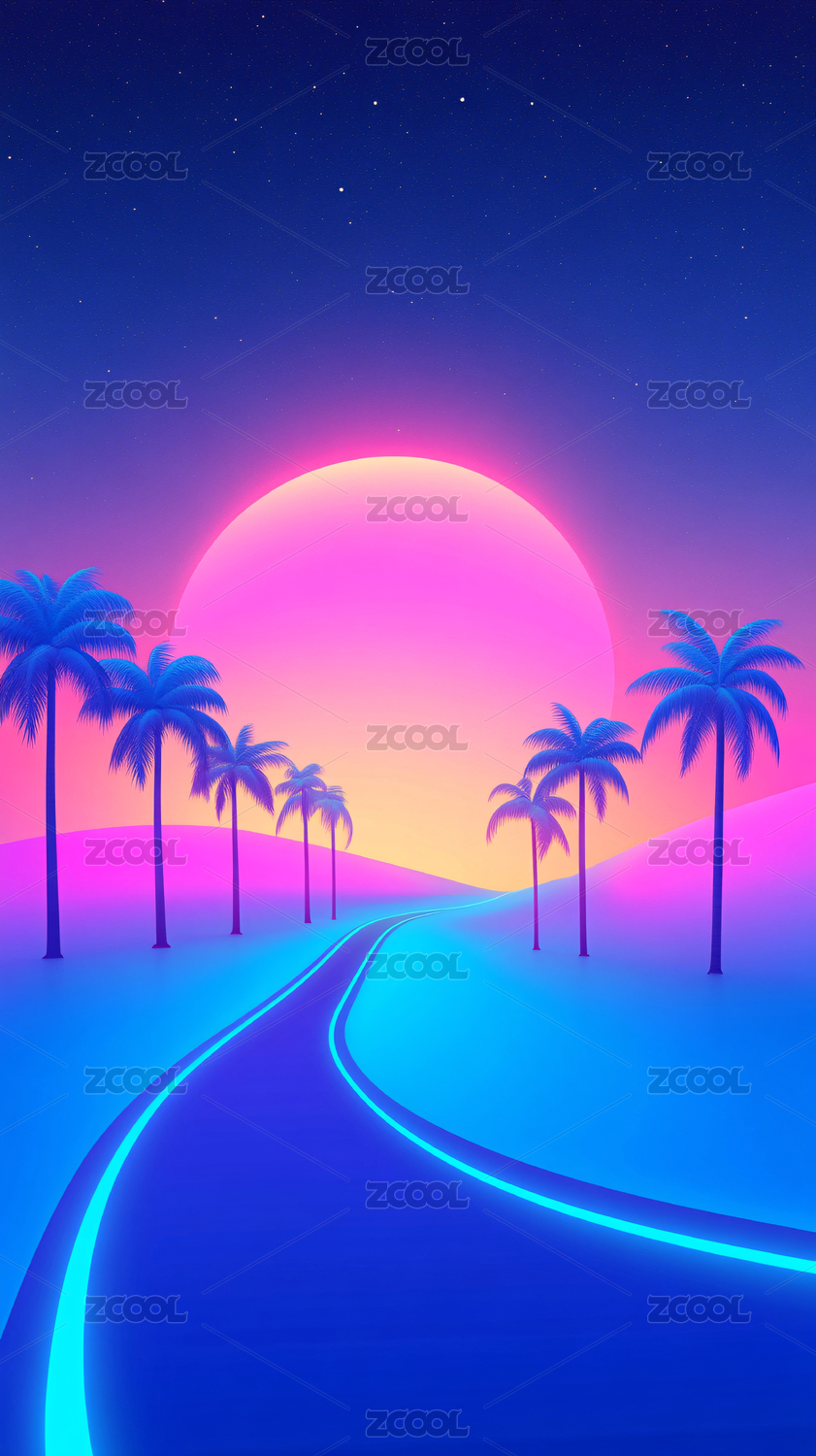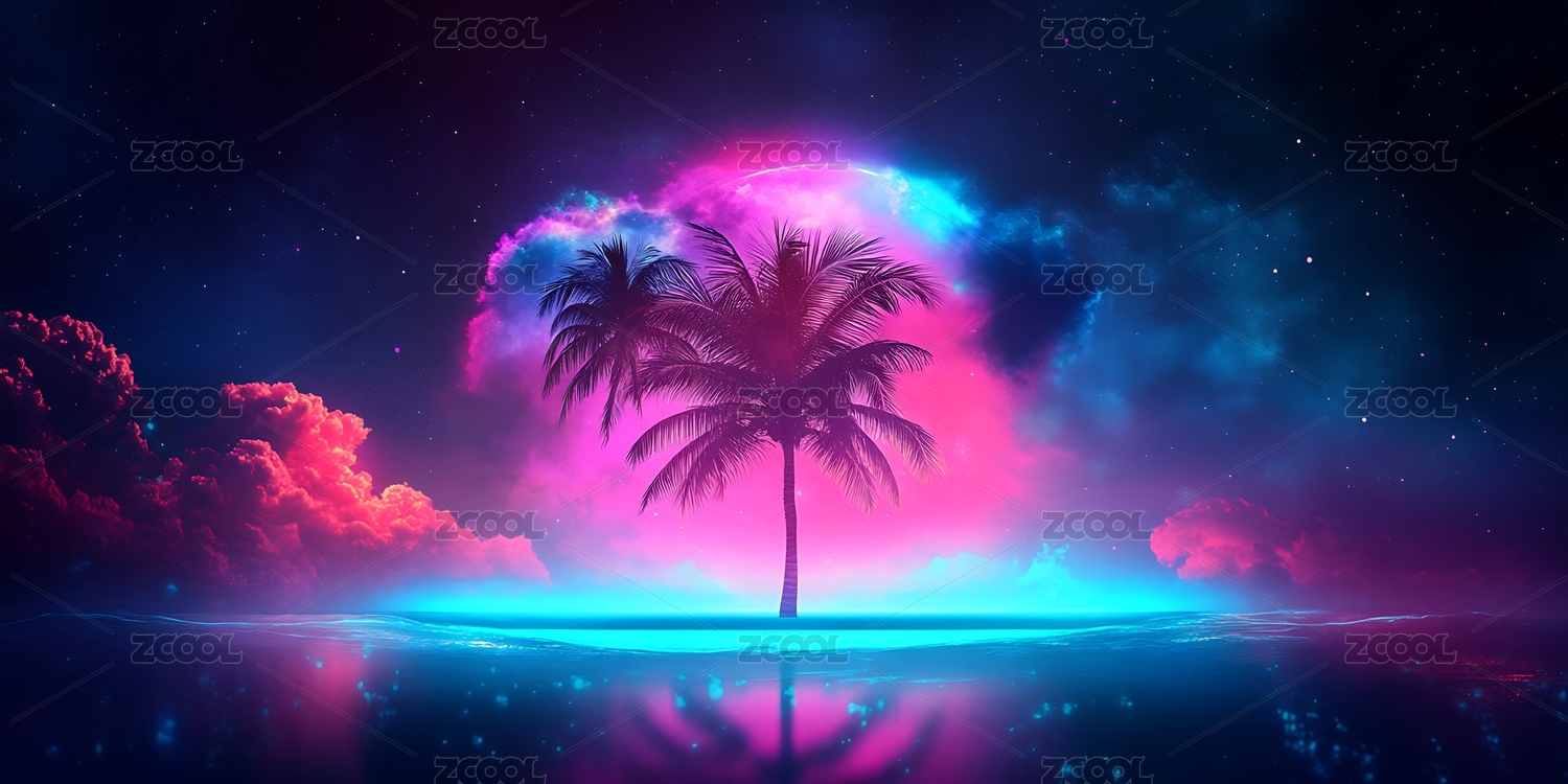 艺术,创意,自然,海浪,海洋,风景,热带,霓虹灯,棕榈树,夜晚