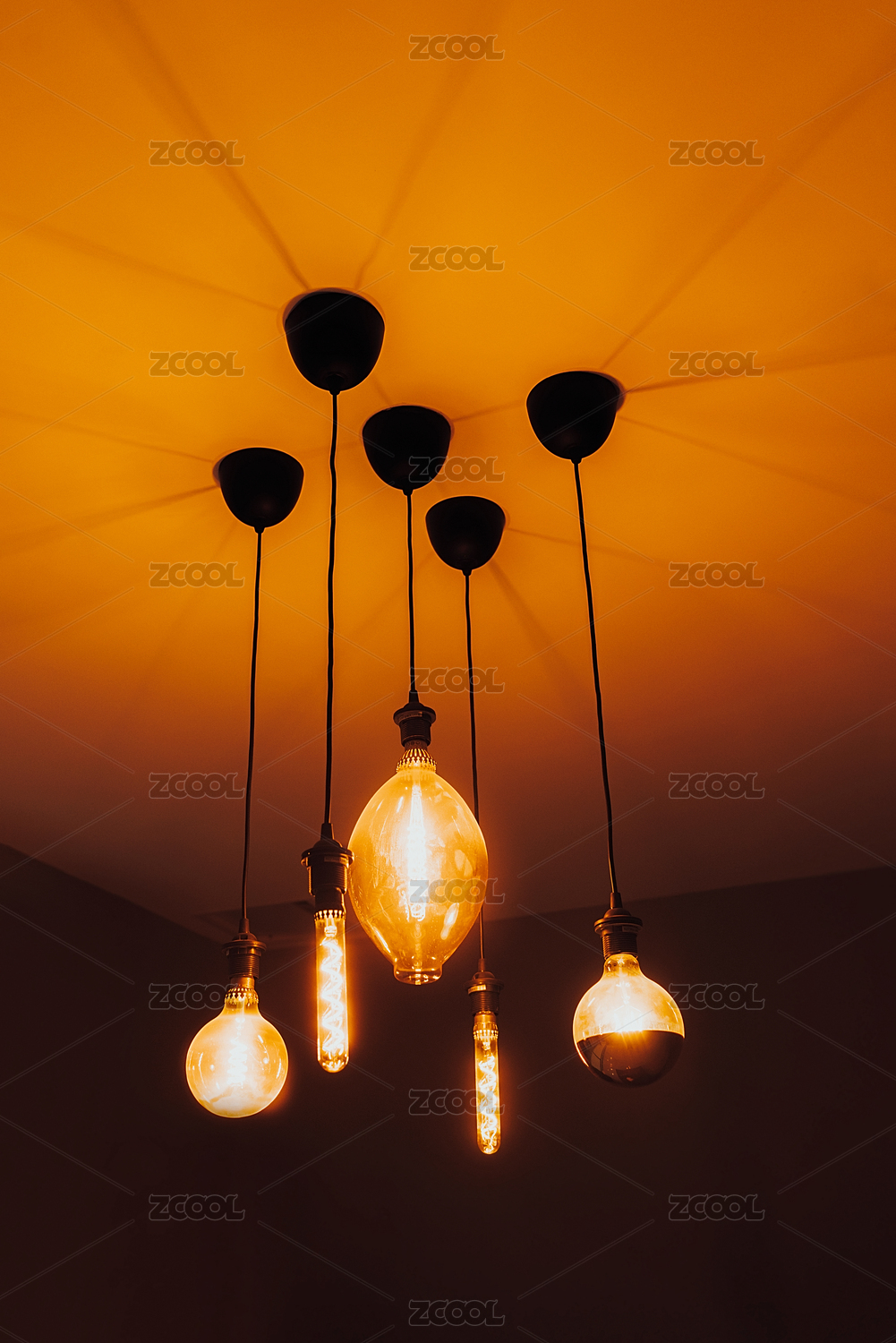 舒适温暖的黄色灯光。老式爱迪生灯泡挂在室内。特写镜头