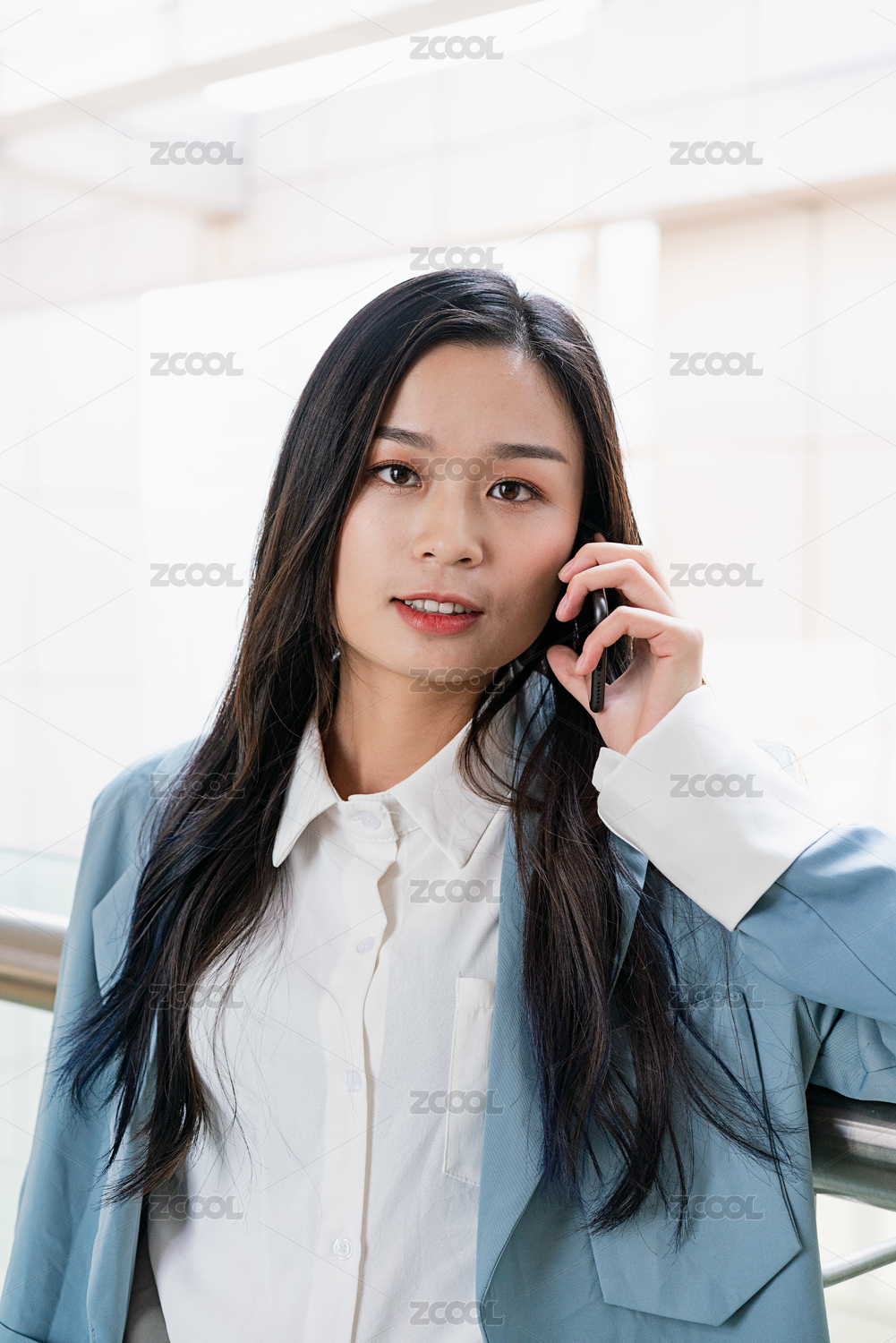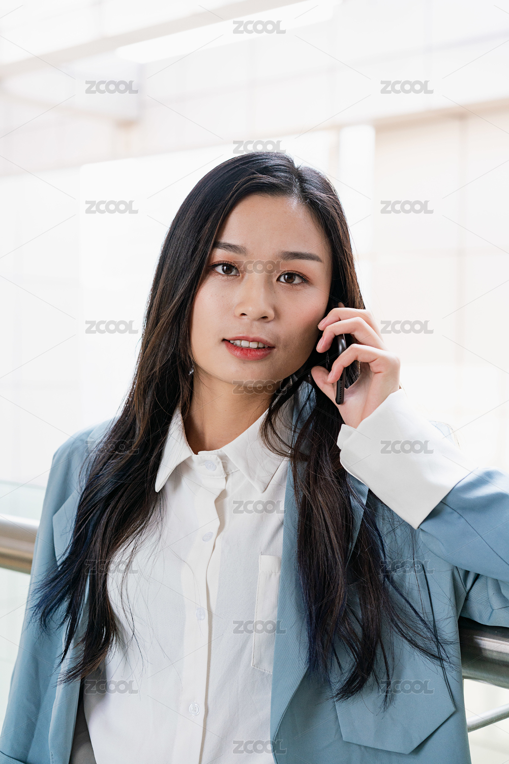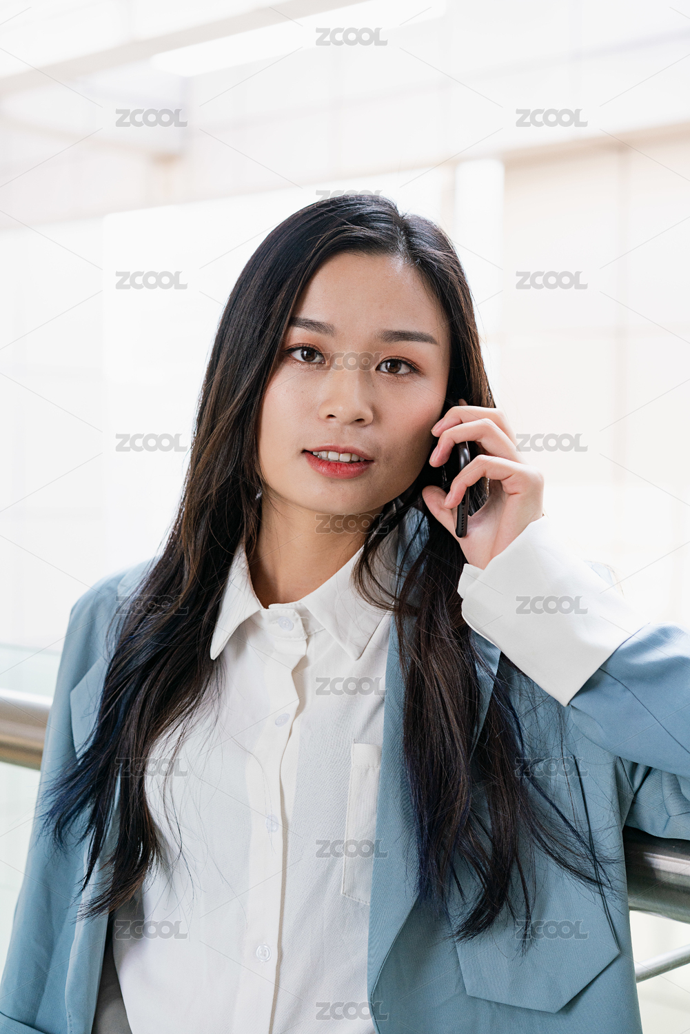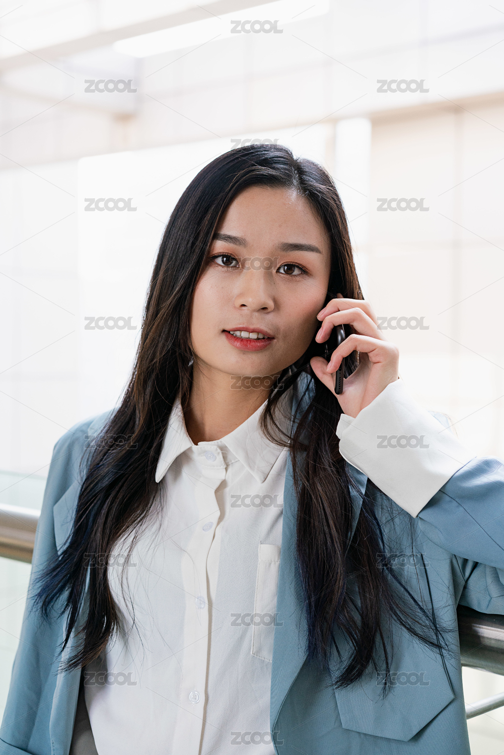 年轻商务女士在办公楼连廊内打电话