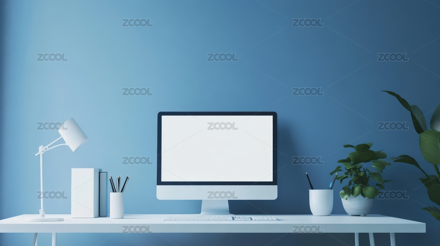 蓝色背景下桌子上的笔记本电脑和咖啡杯特写