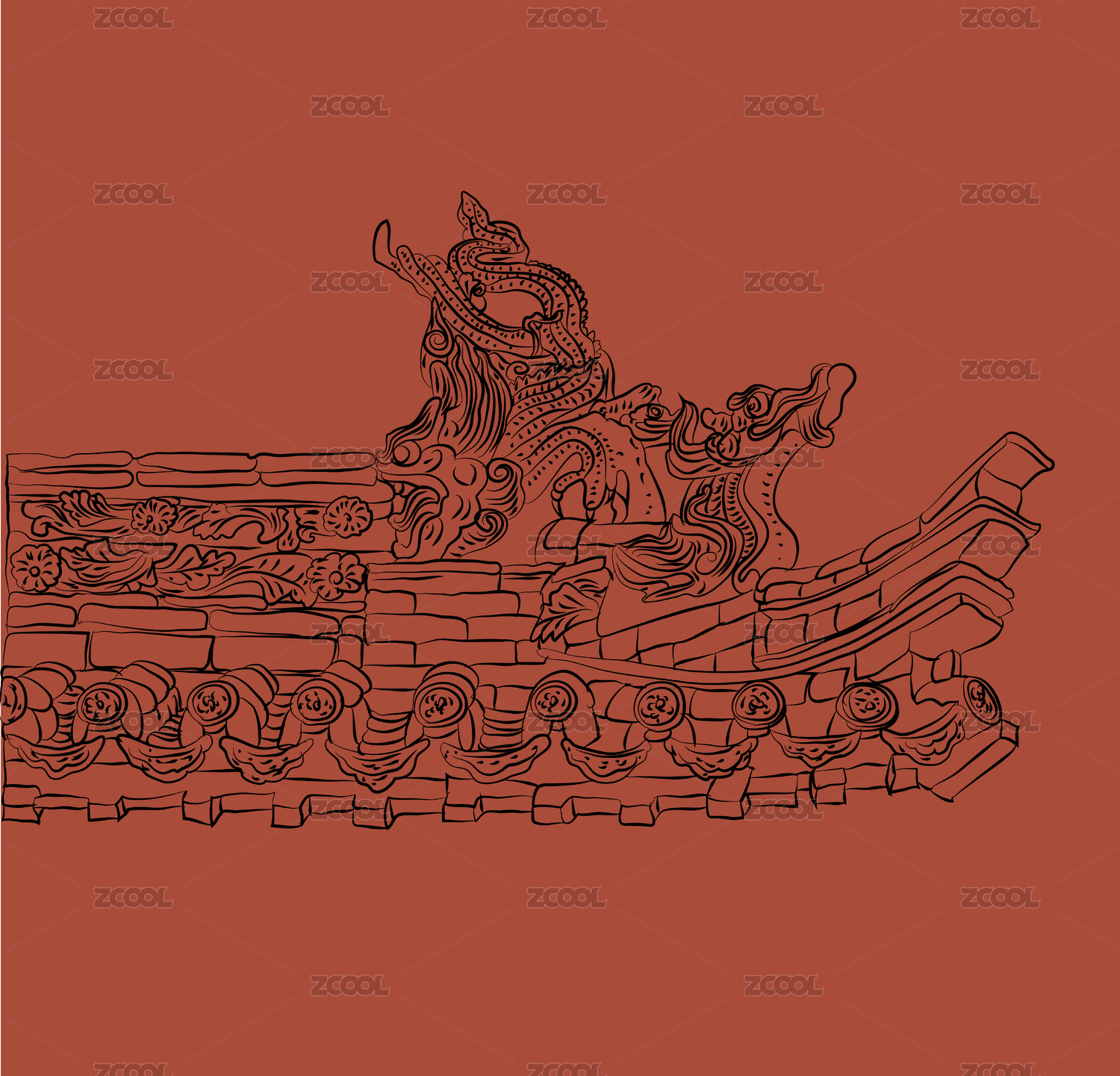 古建筑古典屋脊飞檐龙螭吻龙矢量手绘线稿