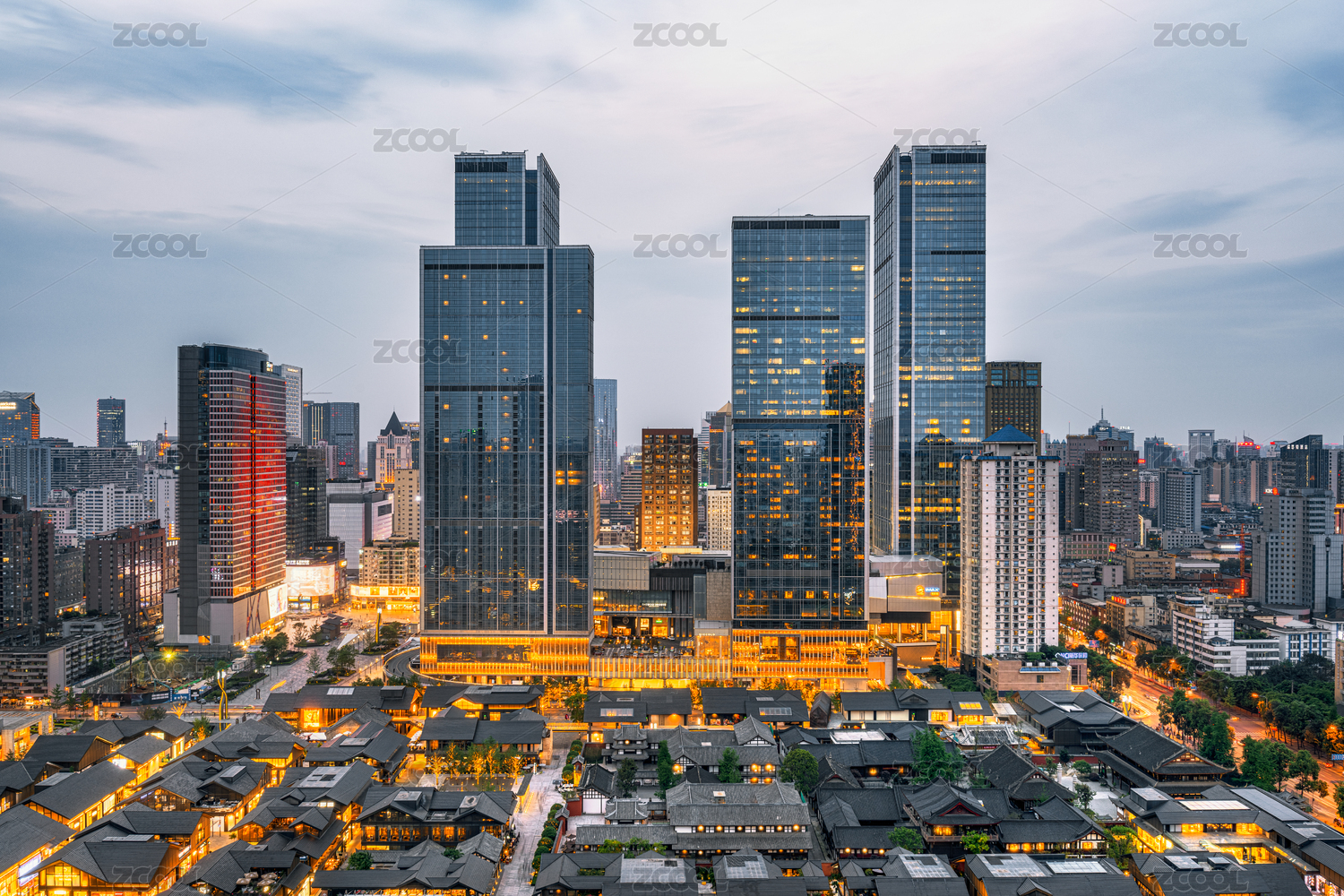 中国四川成都市区太古里商业区和CBD楼群夜景