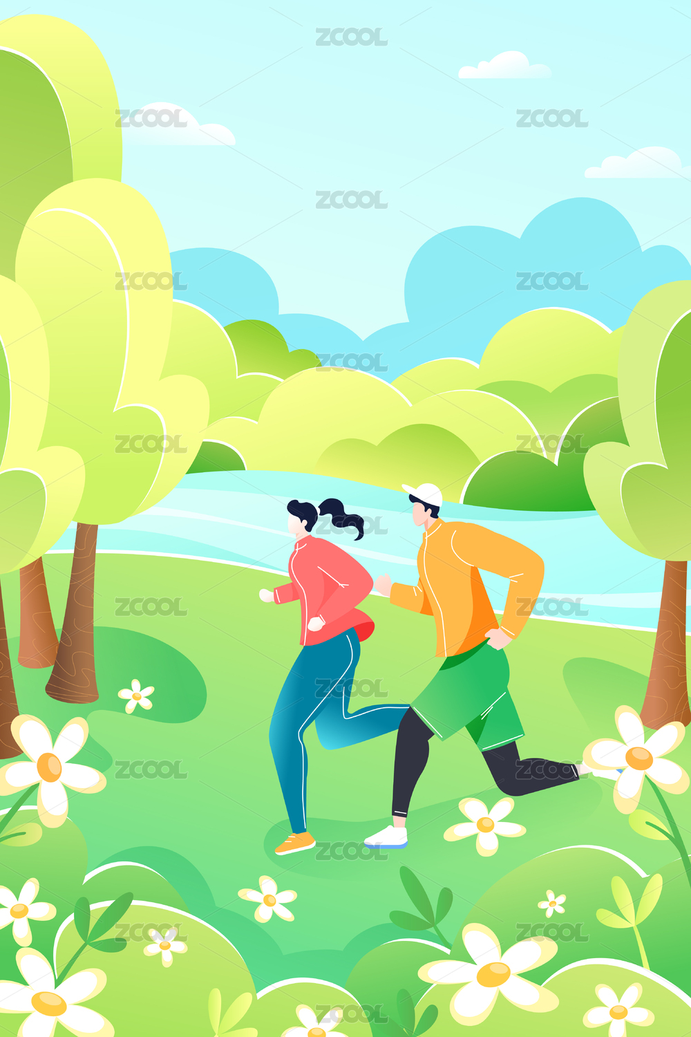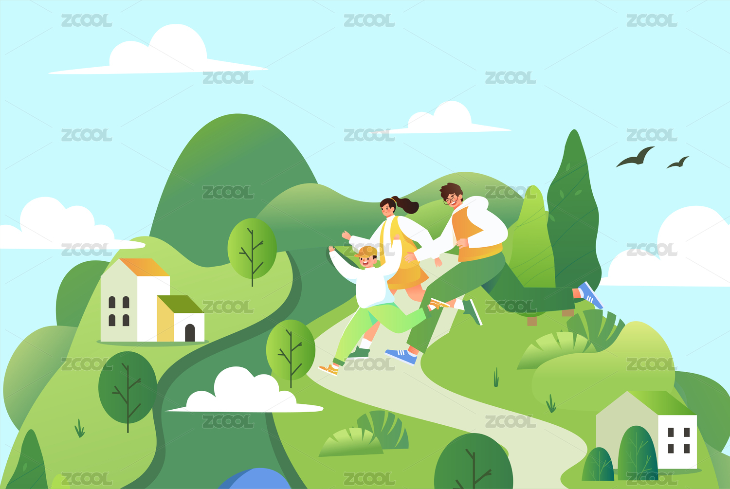 卡通立春出行踏青家人跑步风景背景矢量插画