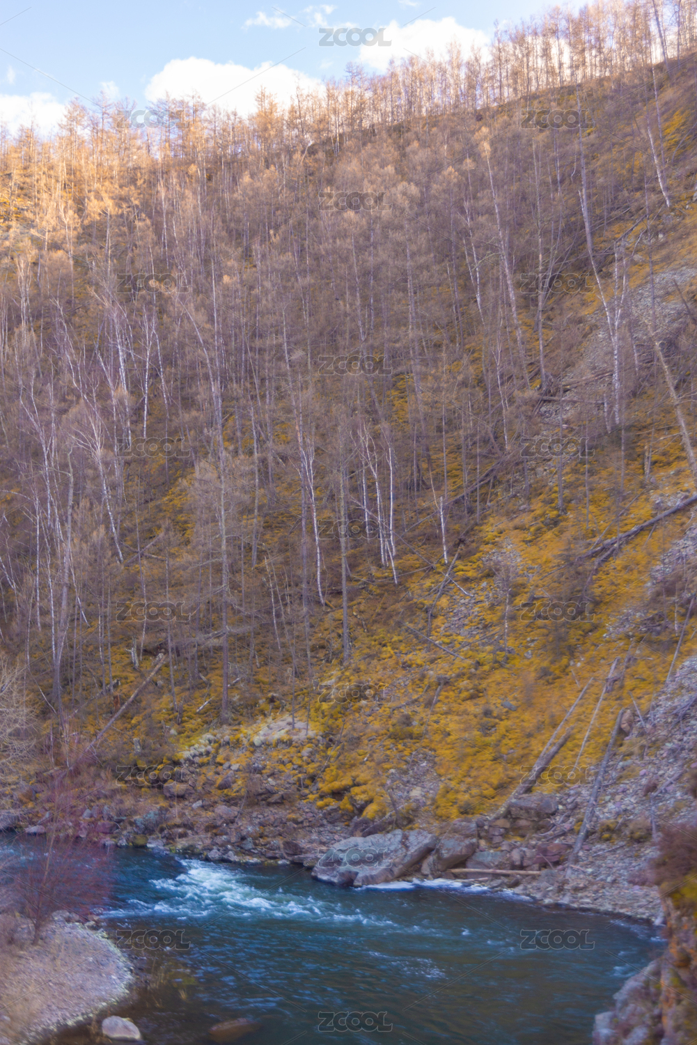 秋天阿尔山金黄色树木树叶和溪流的自然风景
