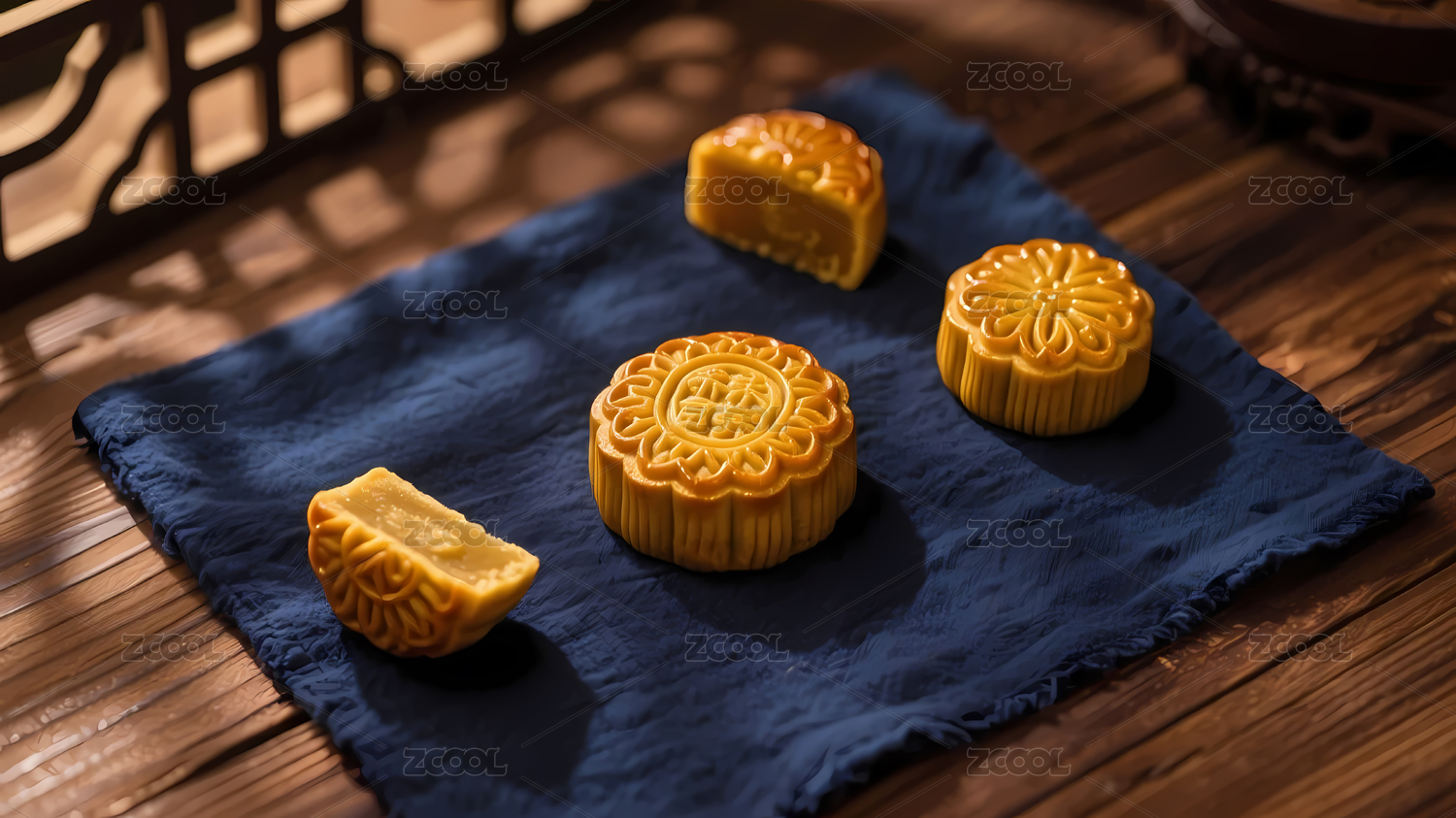 木桌蓝布金黄月饼
