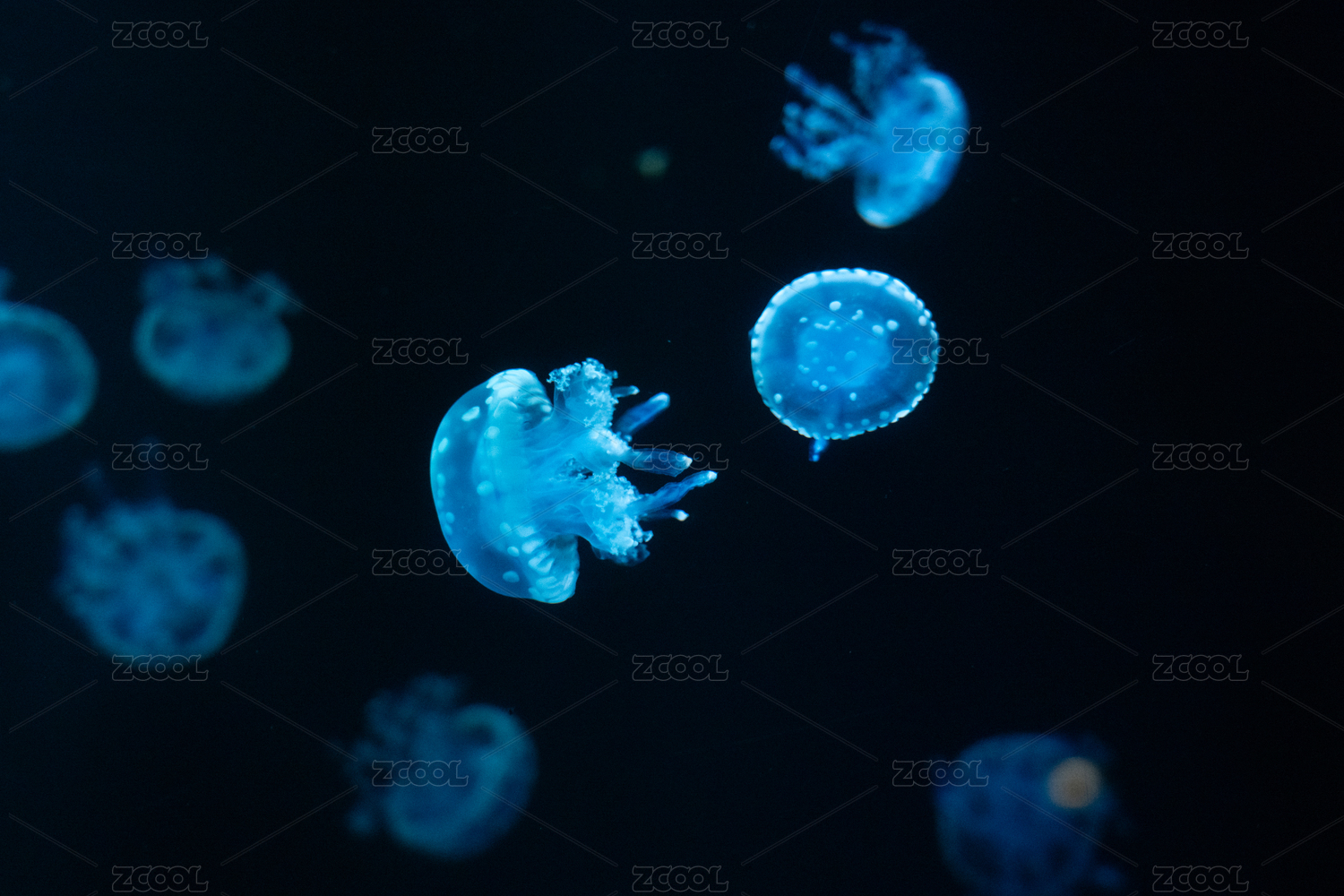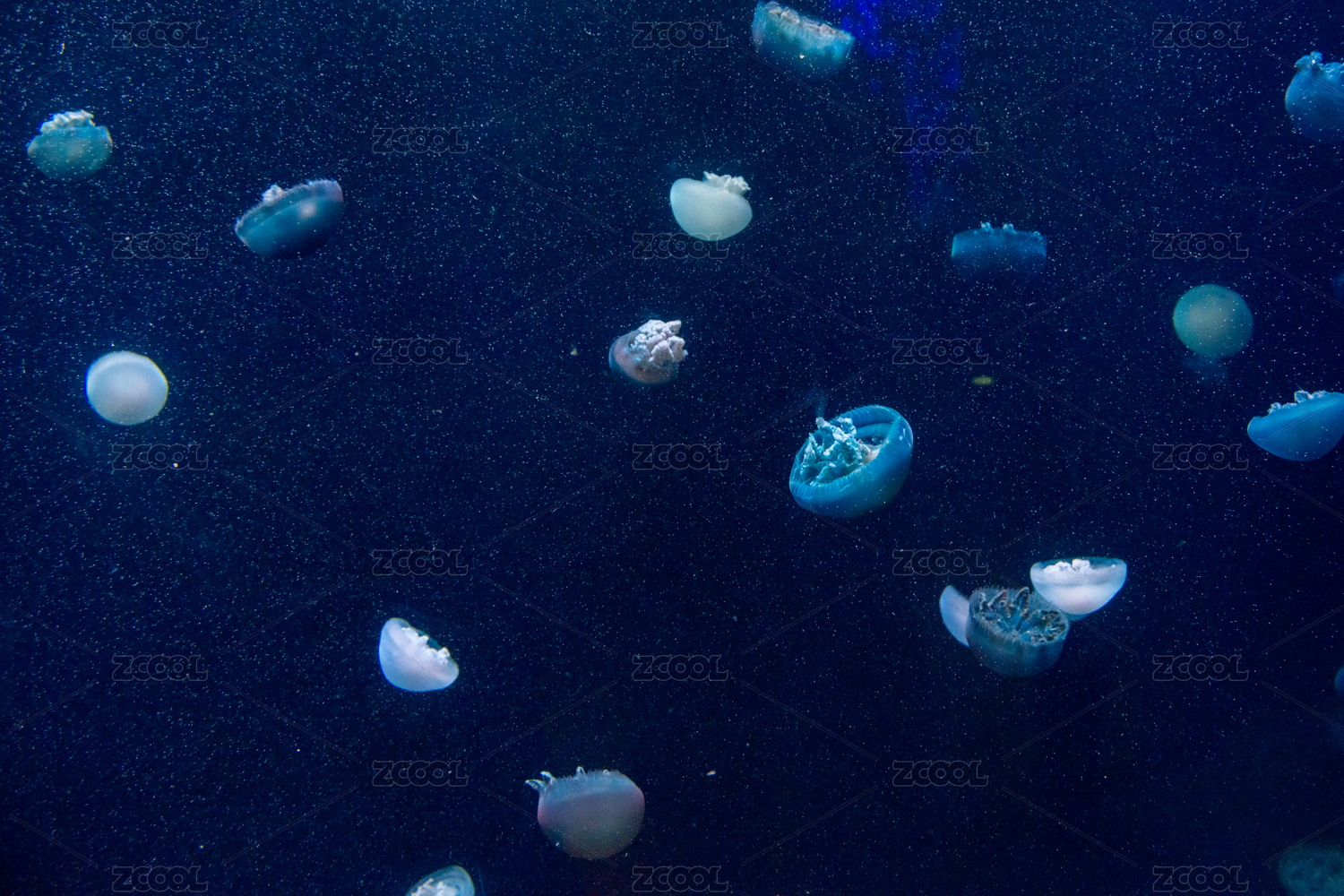 水族馆里蓝色霓虹灯下美丽的水母在蓝色背景