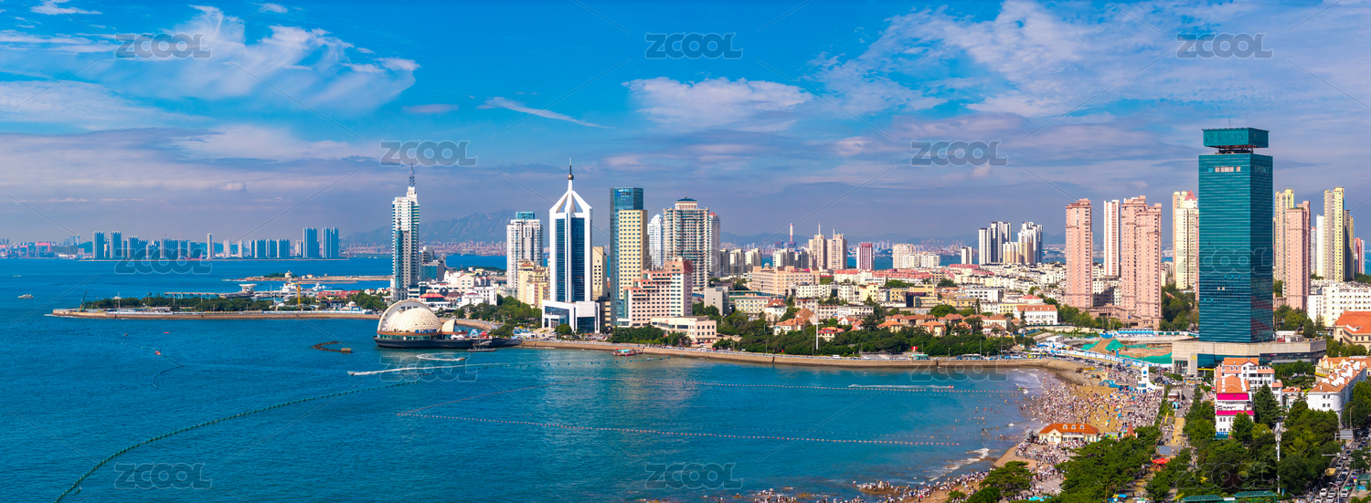 高视角俯瞰中国山东省青岛第一海水浴场日景