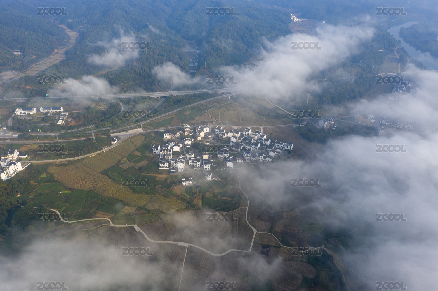 航拍云雾中若隐若现的中国安徽省黄山市歙县石潭