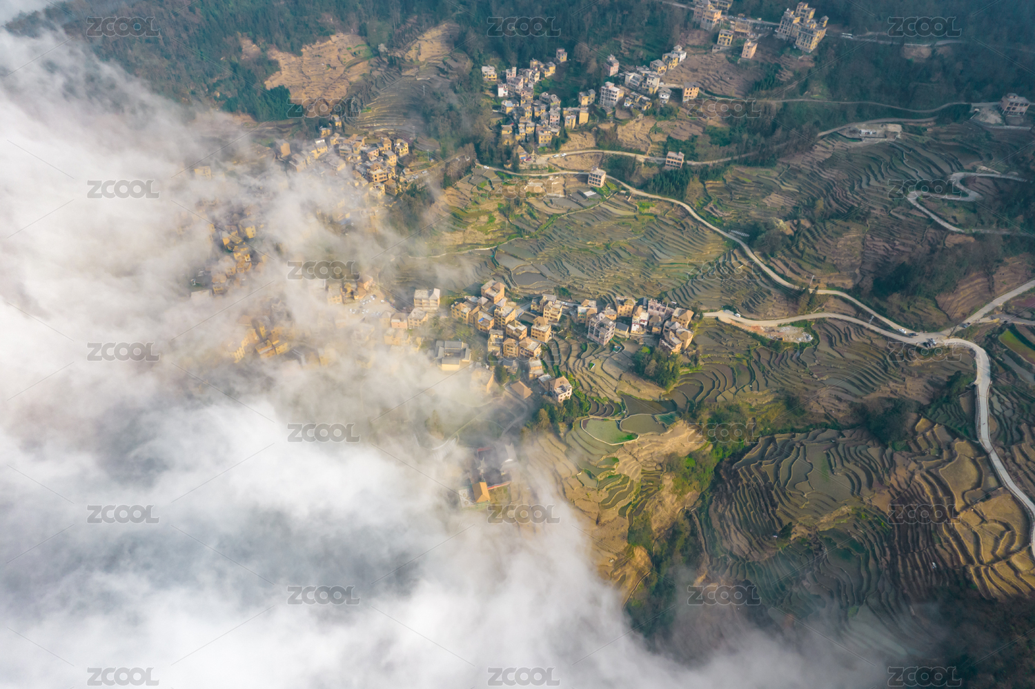 中国贵州龙里湾滩河镇山川田园晨雾风光
