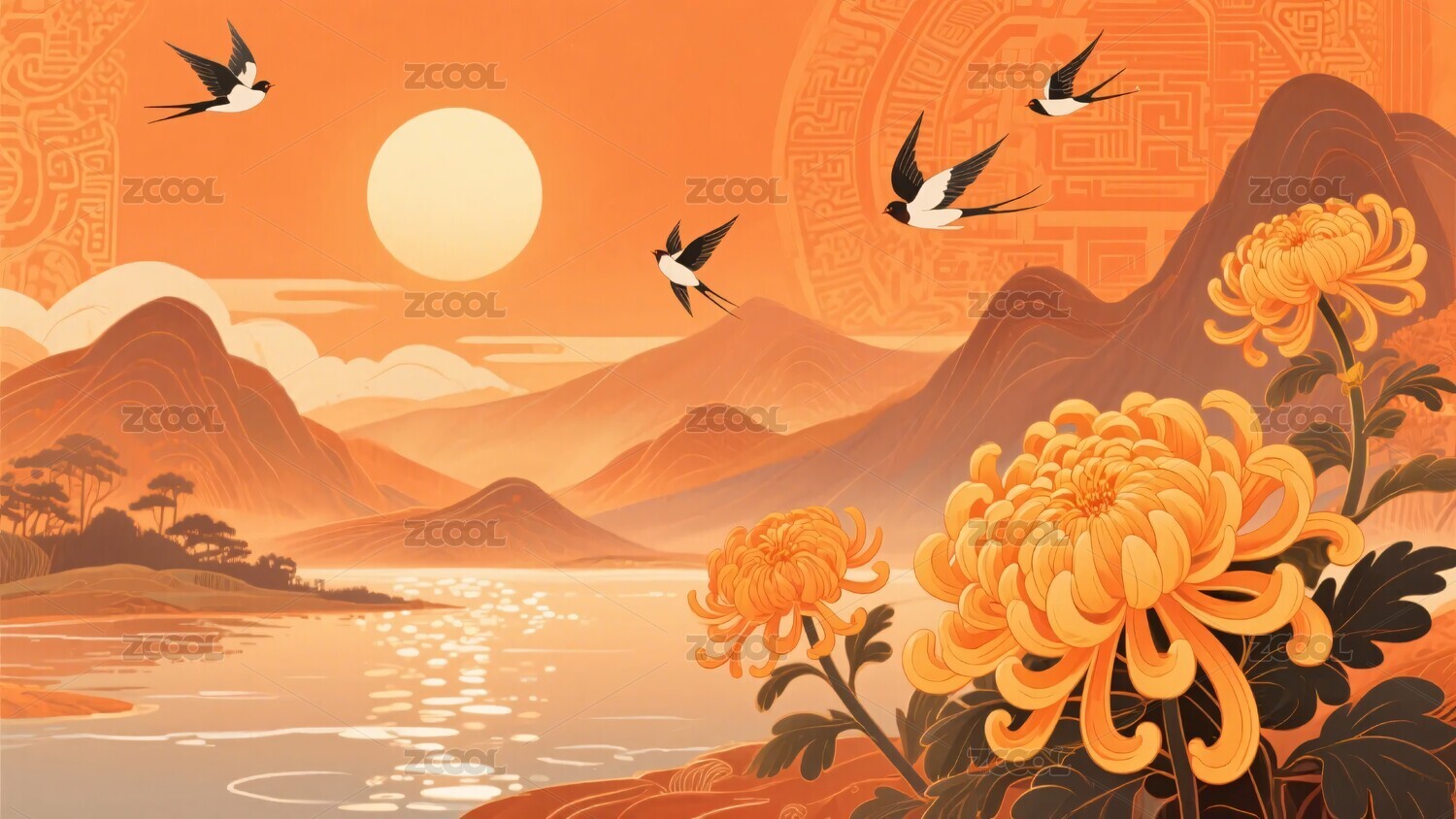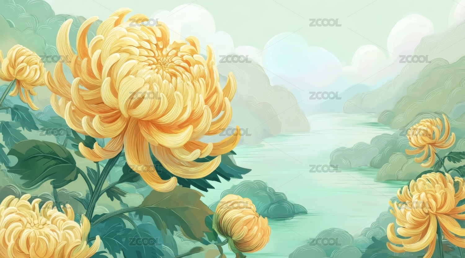 中国风山水菊花插画