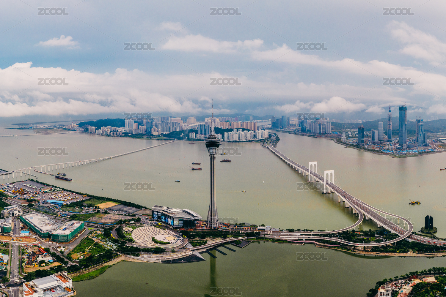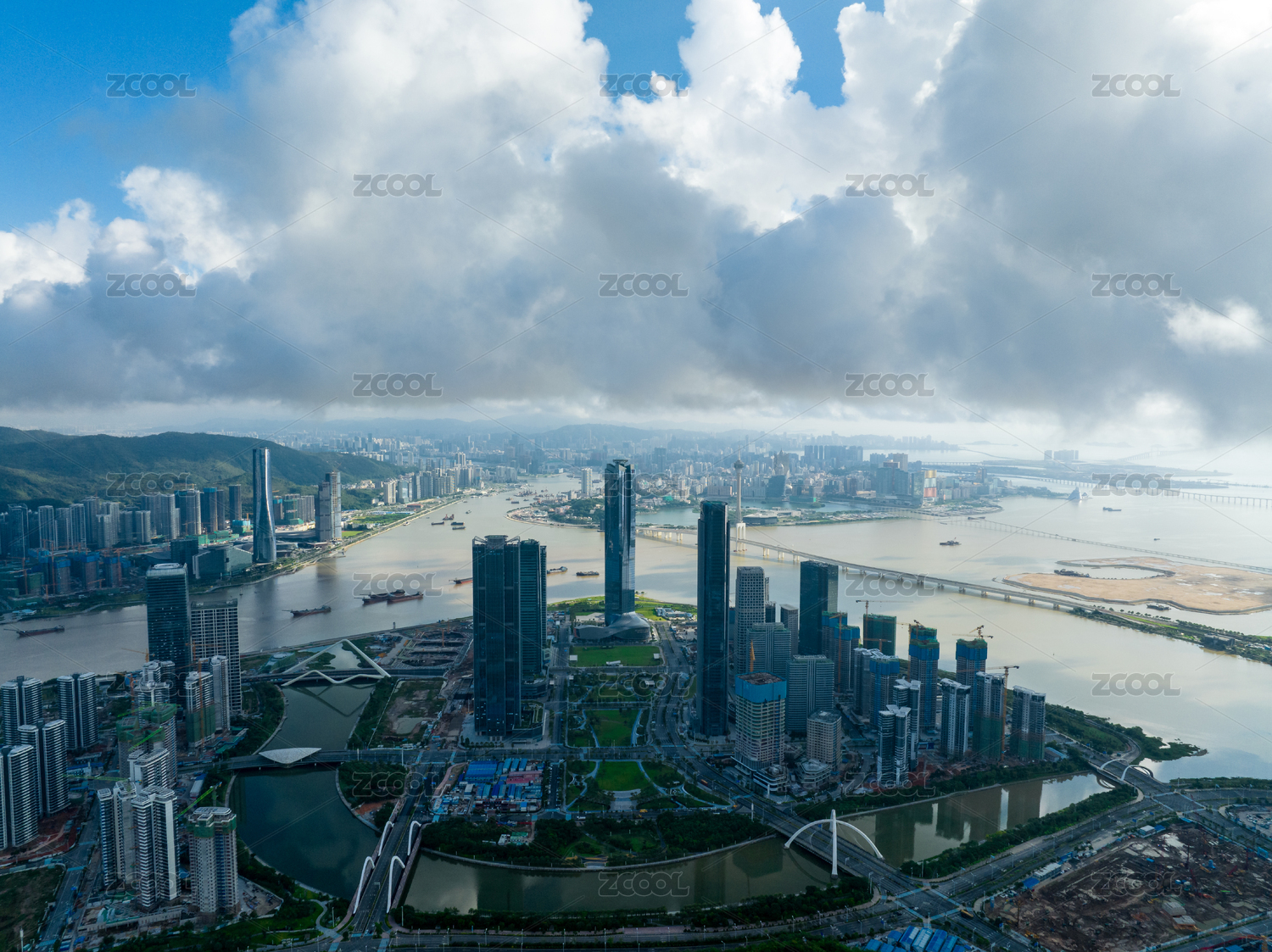 大湾区珠海横琴金融岛澳门城市风光航拍