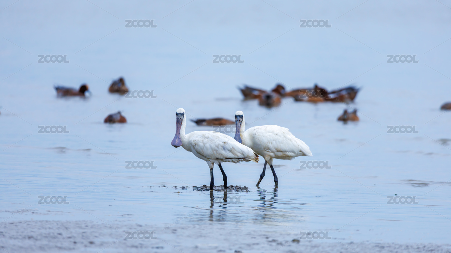 河口浅滩涂上觅食的黑脸琵鹭鸟