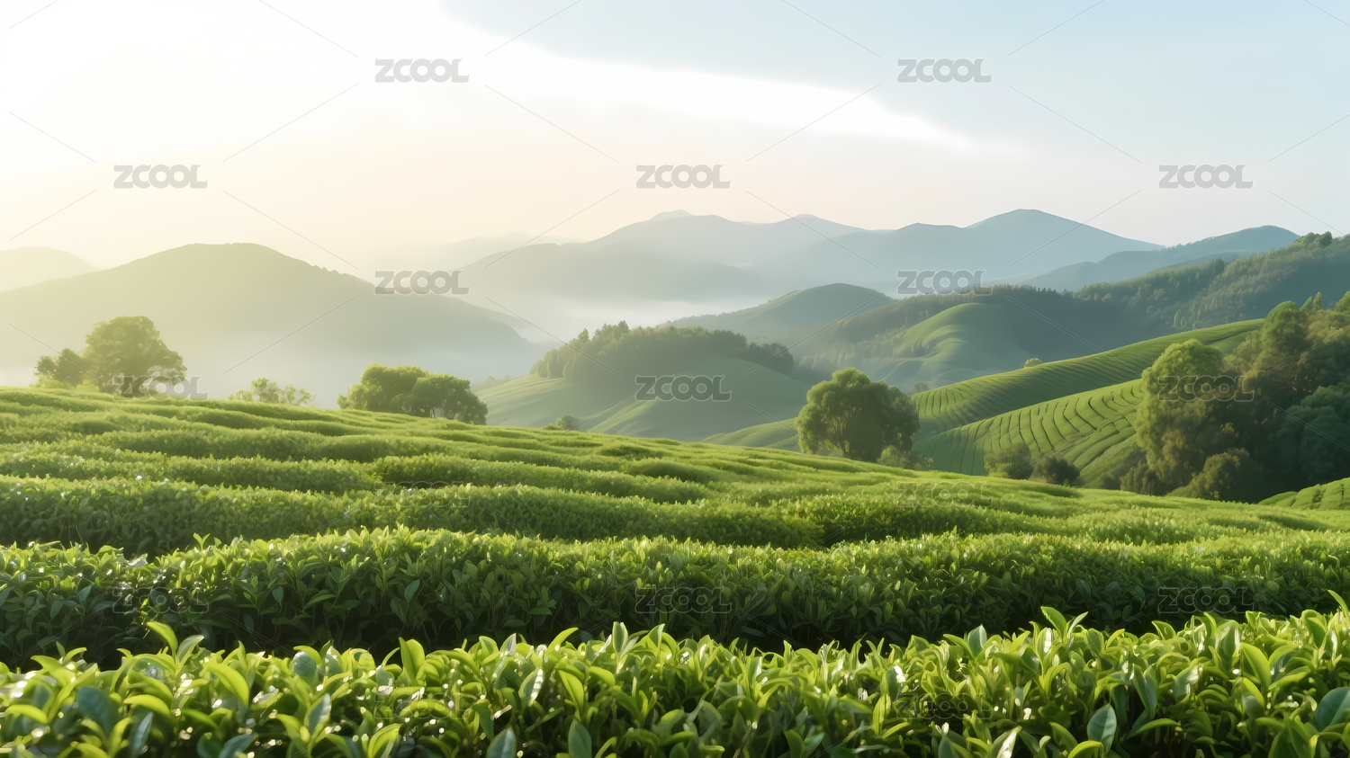 翠绿茶园与晨雾远山
