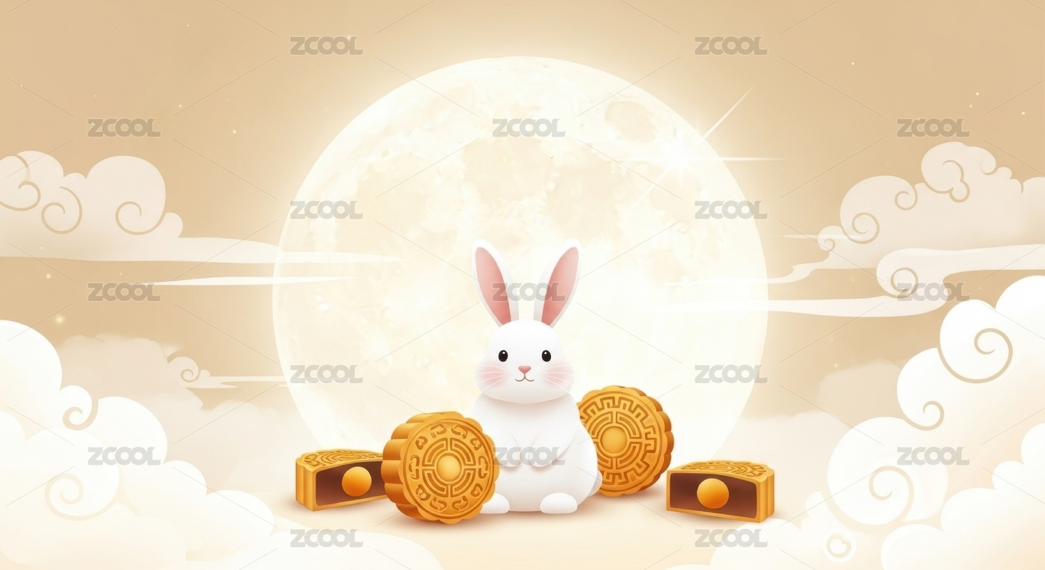 中秋节月亮下的月饼和玉兔插画背景壁纸