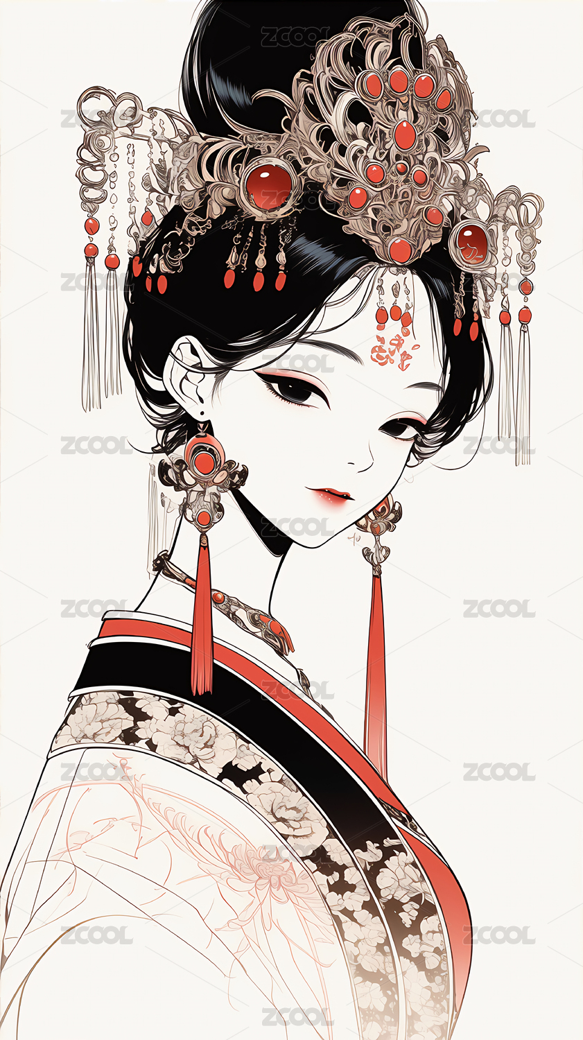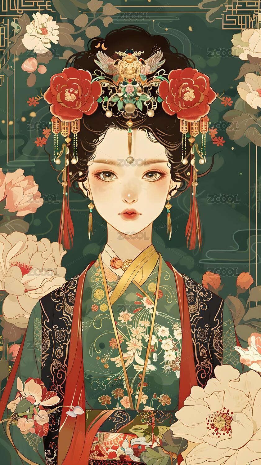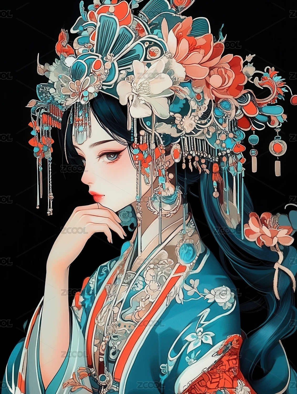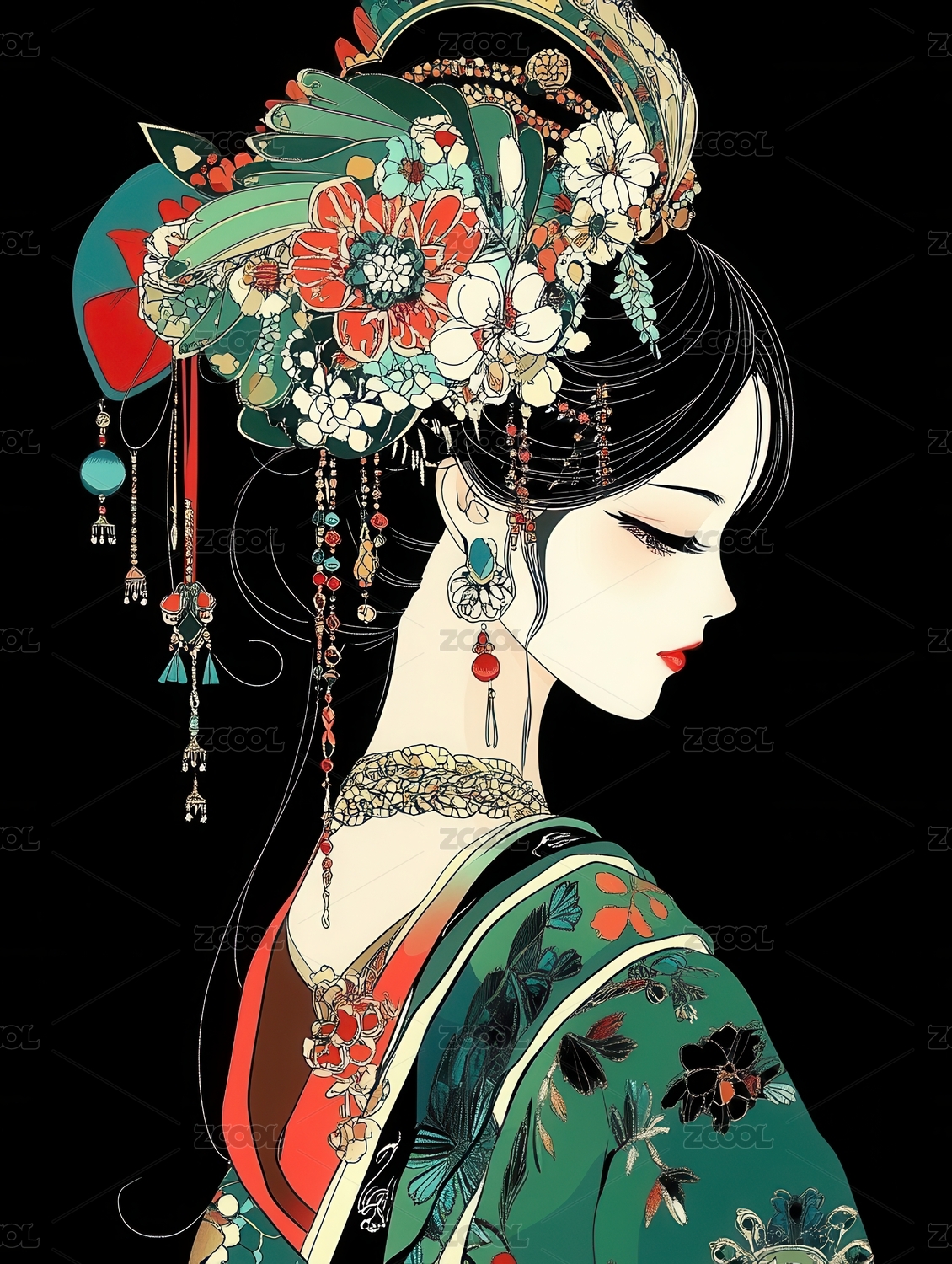 唯美身着古装华丽头饰的美丽女孩侧脸