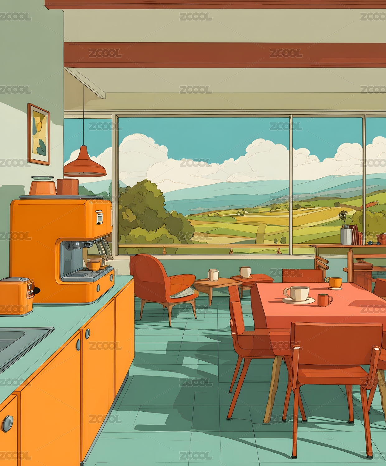 室内舒适躺椅和窗外的景色插画