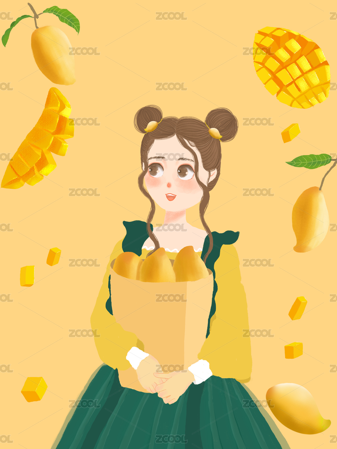 抱着一袋子芒果的女孩看着漂浮的芒果