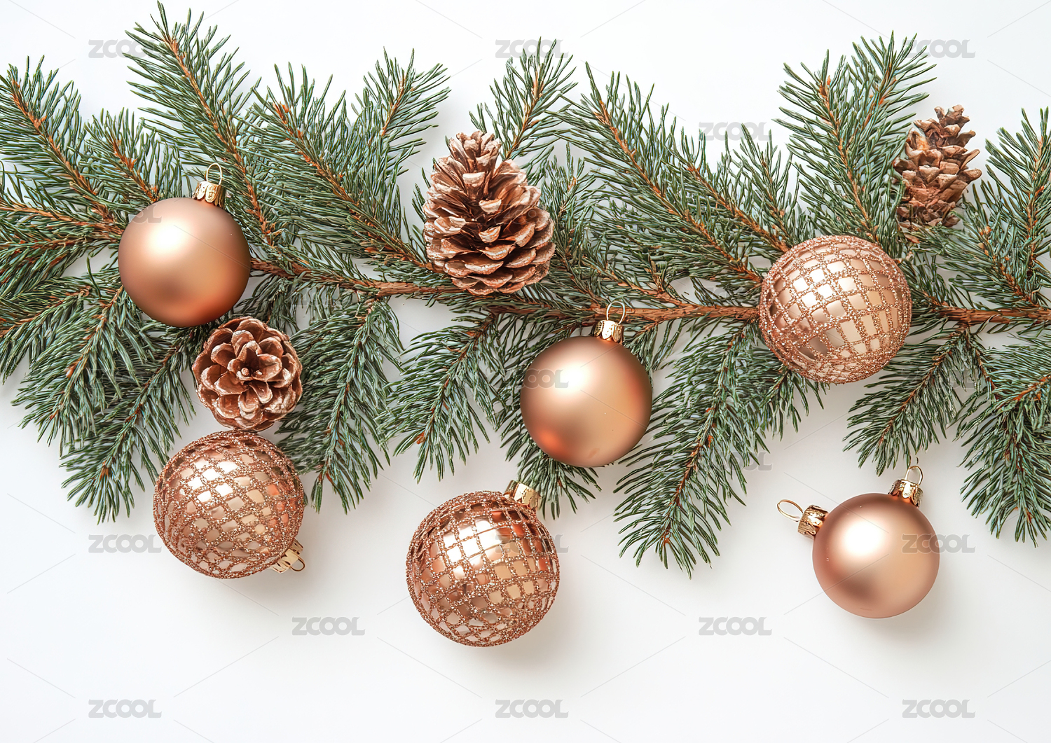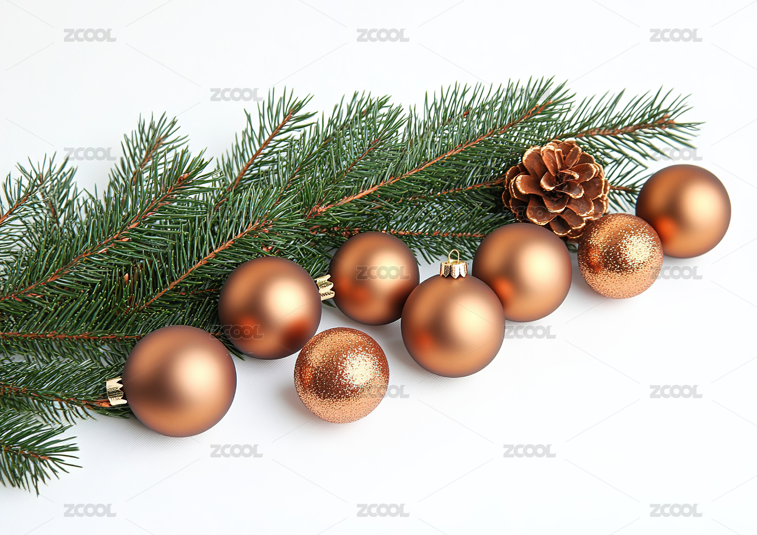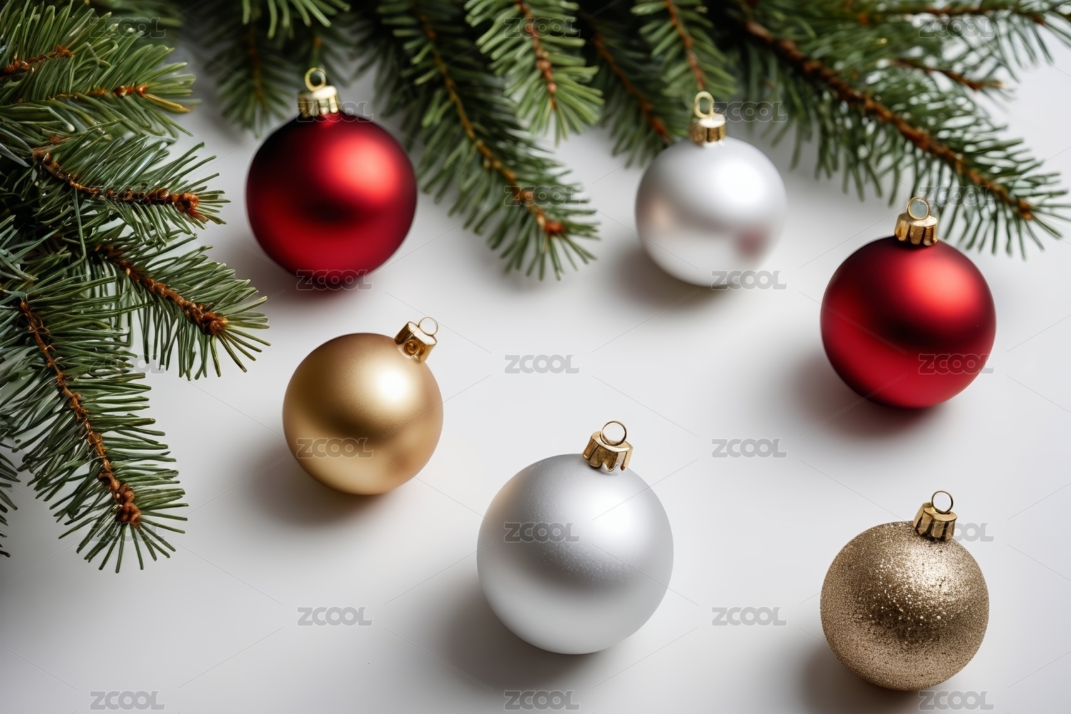 白色背景有五个圣诞装饰品有松树枝高清图片