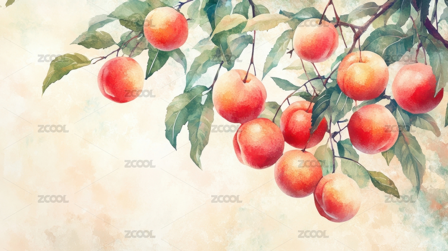 水彩桃子枝干插画