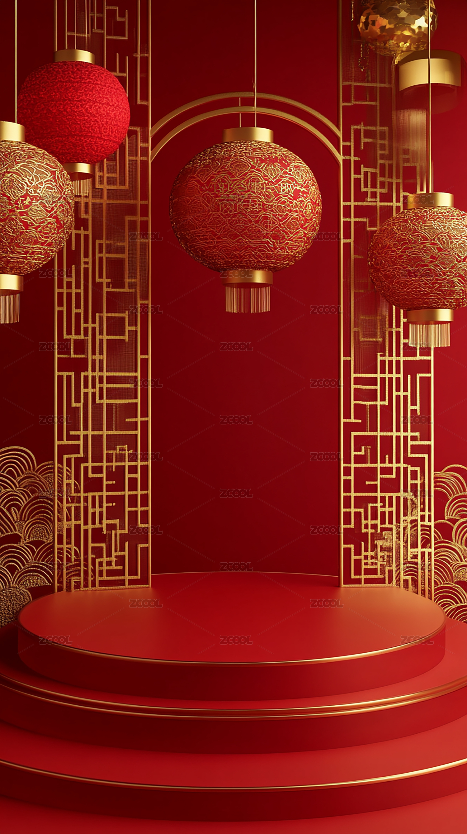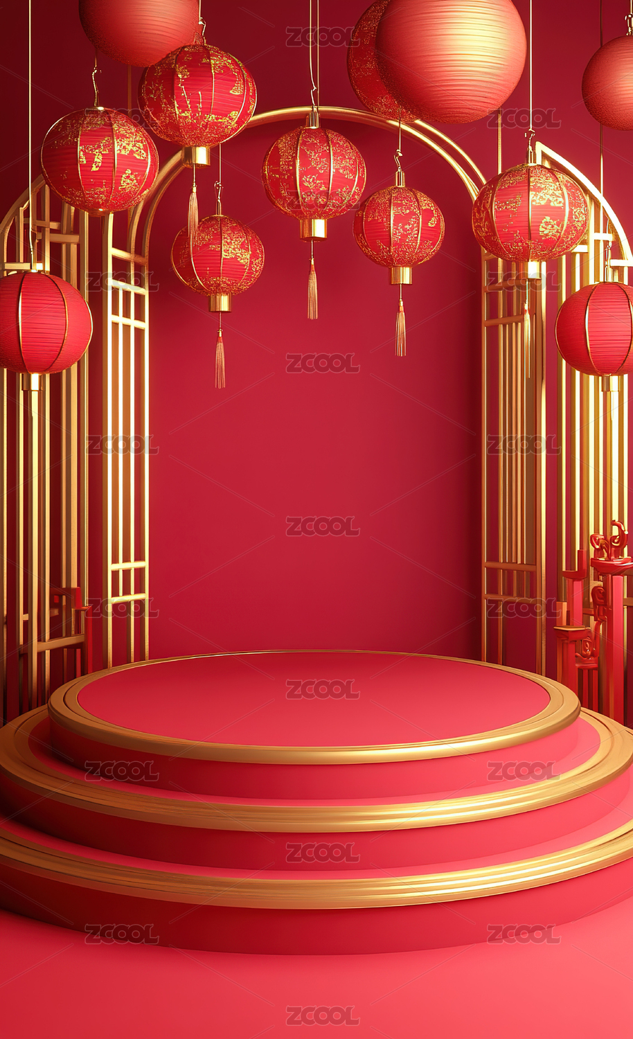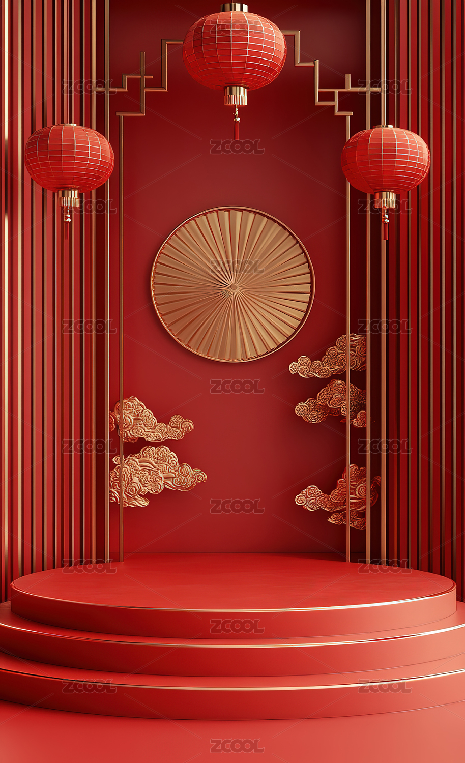 3D场景红色拱门灯笼发光圆形电商产品展台