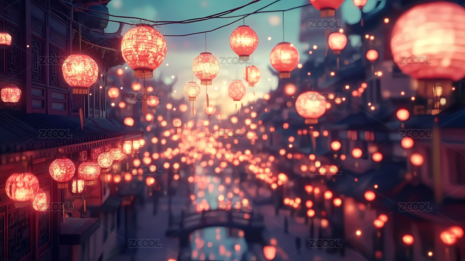 国风节日傍晚红色灯笼城市背景虚化3D插画