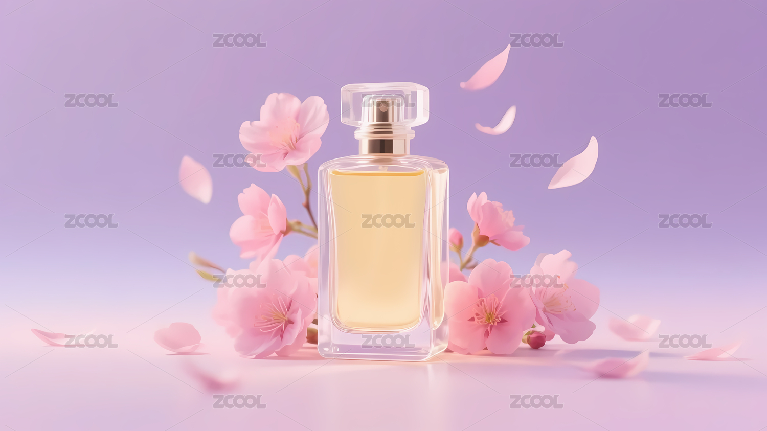 香水瓶与樱花瓣的浪漫氛围