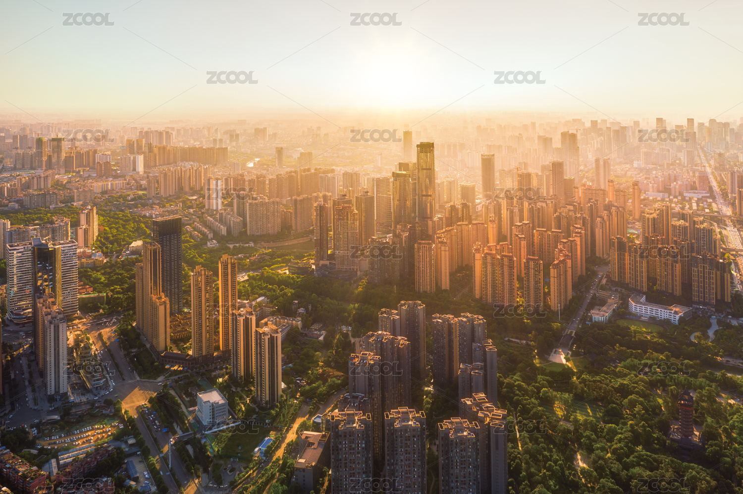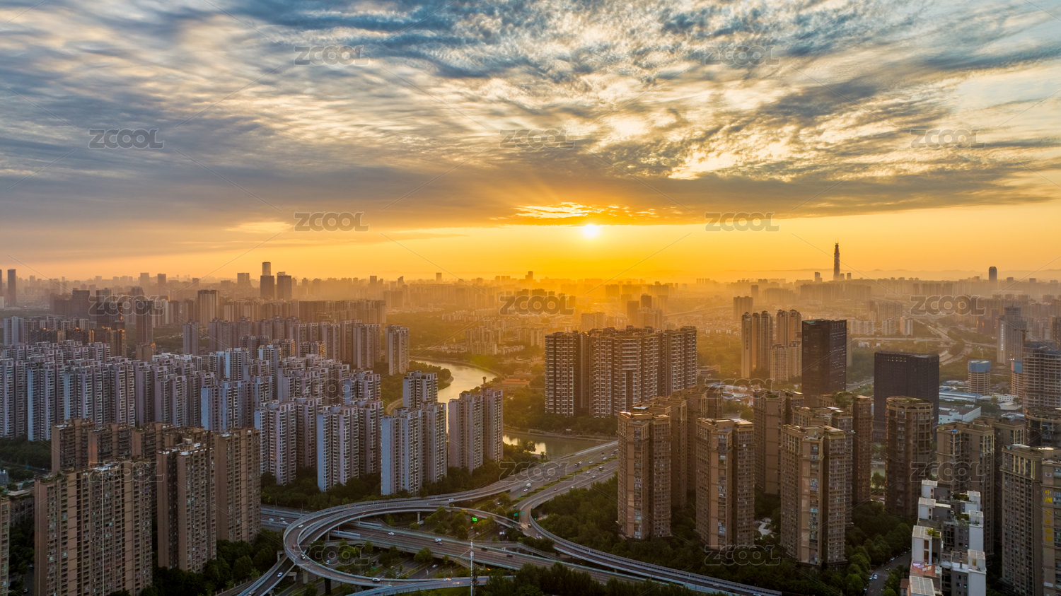中国四川成都攀成钢塔子山周边建筑落日航拍图