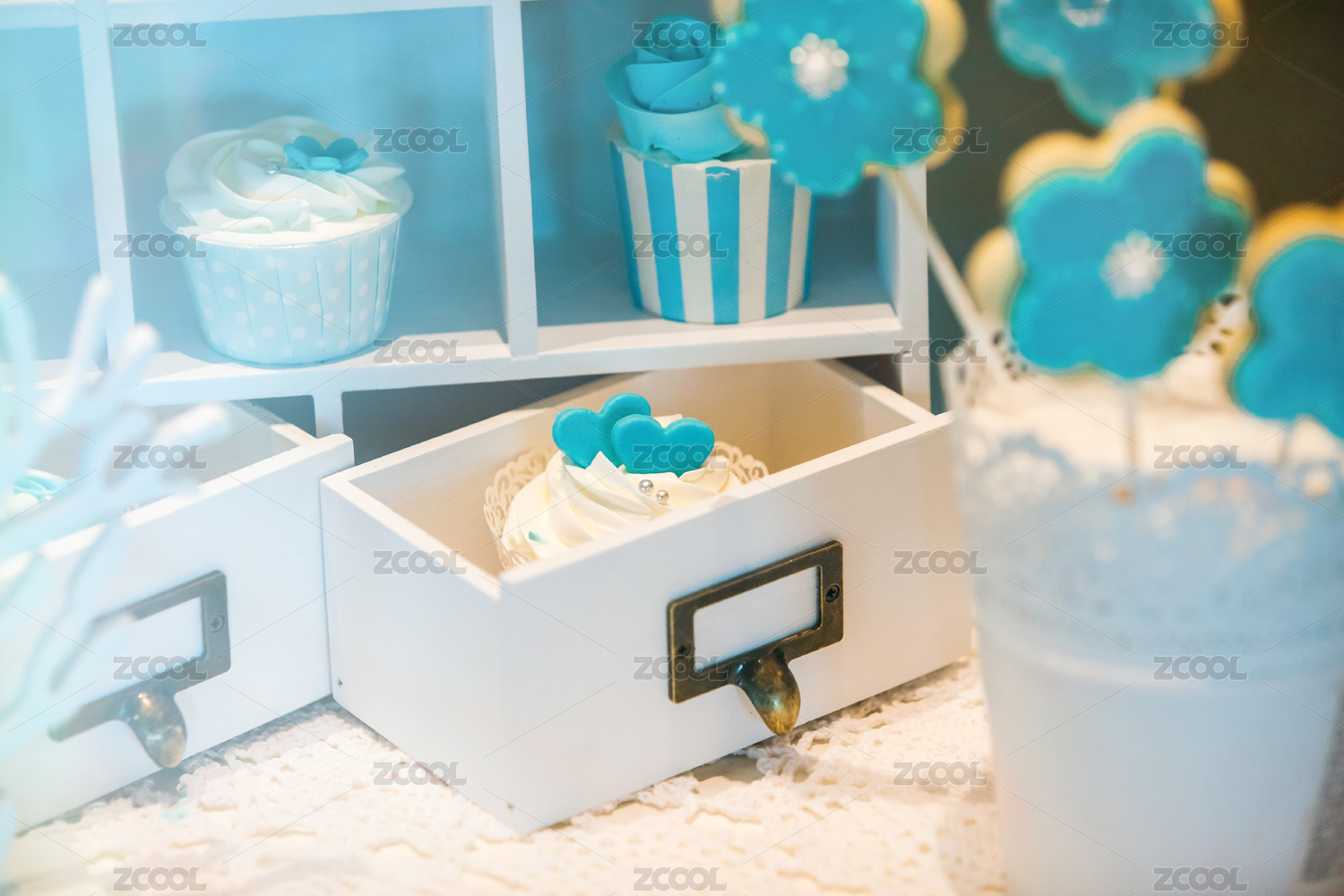 户外草坪的桌子上放着蓝色系蛋糕和甜品。