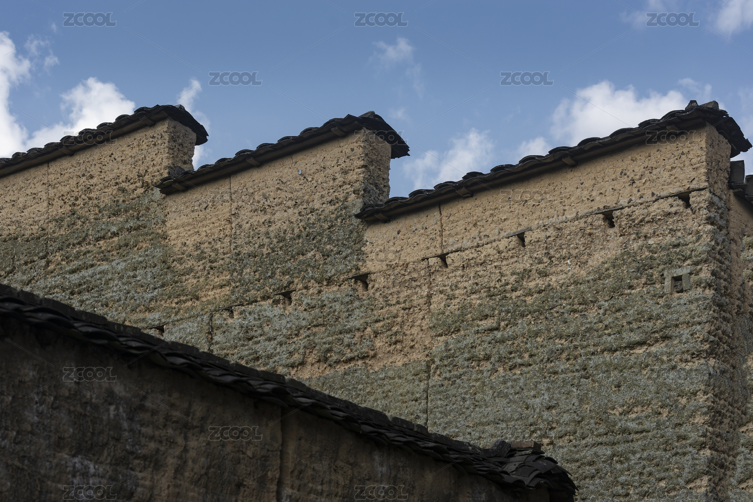蓝天下云南建水团山古村传统民居瓦檐土掌房