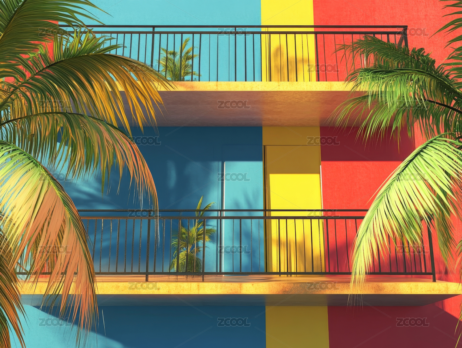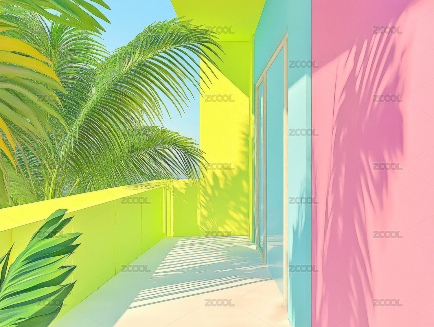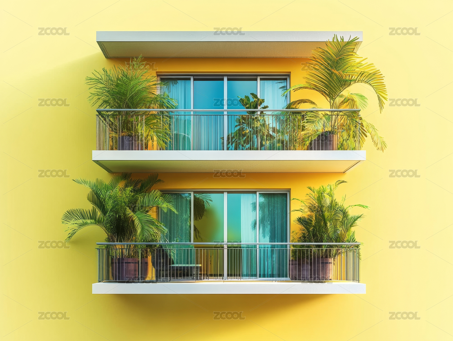 阳台,棕榈树,玻璃门,黄色,建筑,绿色,植物,阳光,阴影