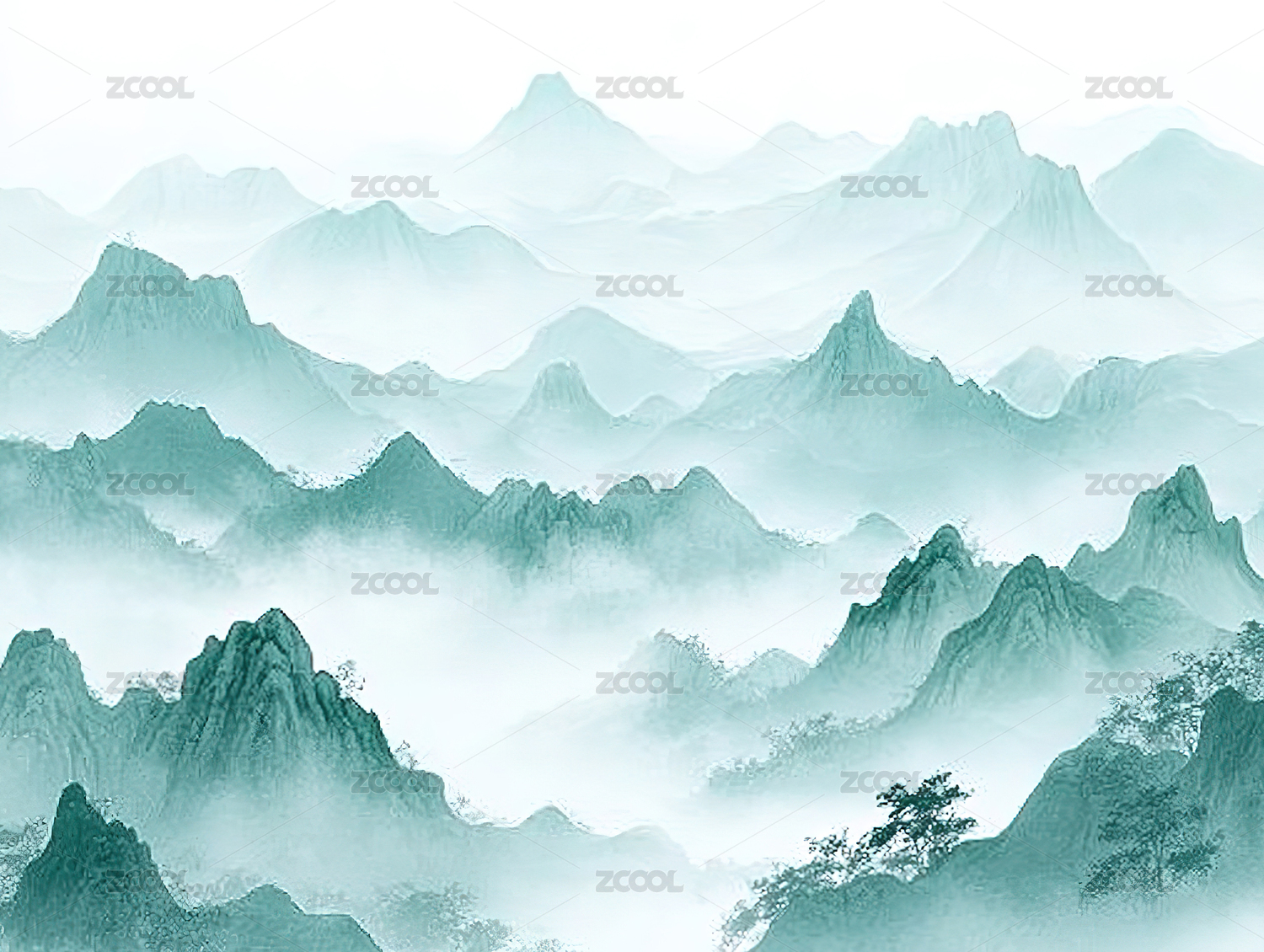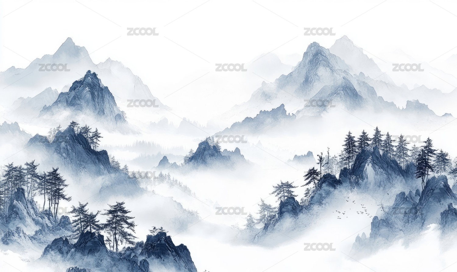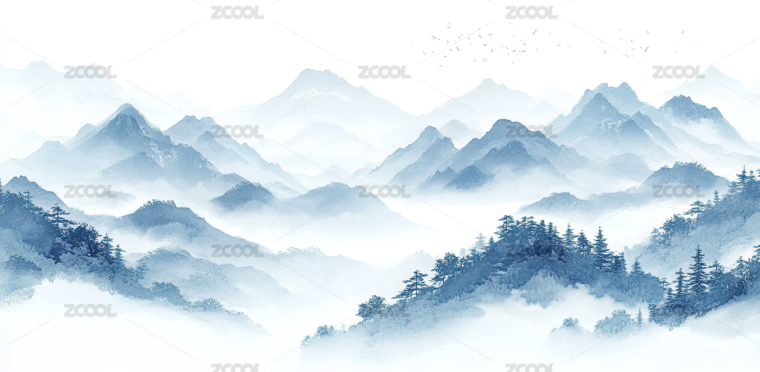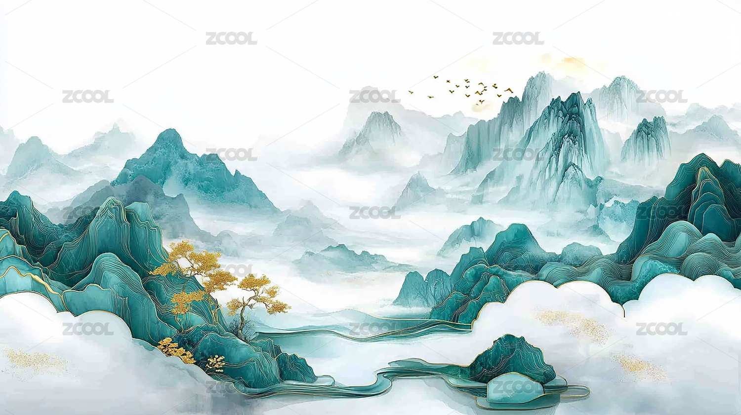 山峰, 飞鸟, 树木,山水画, 青绿山水, 松树, 云雾, 水彩画, 水墨画, 中国画