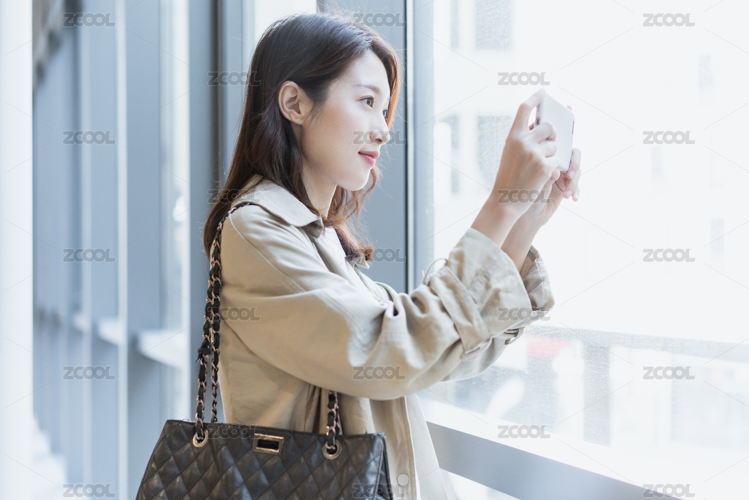 年轻亚洲女人在窗边用手机拍照