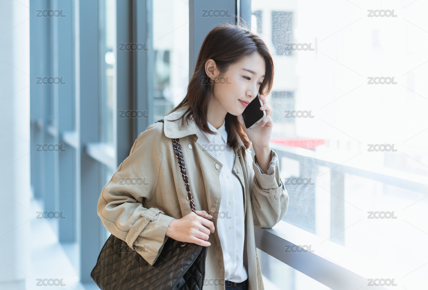 年轻亚洲商务人士在窗边打电话
