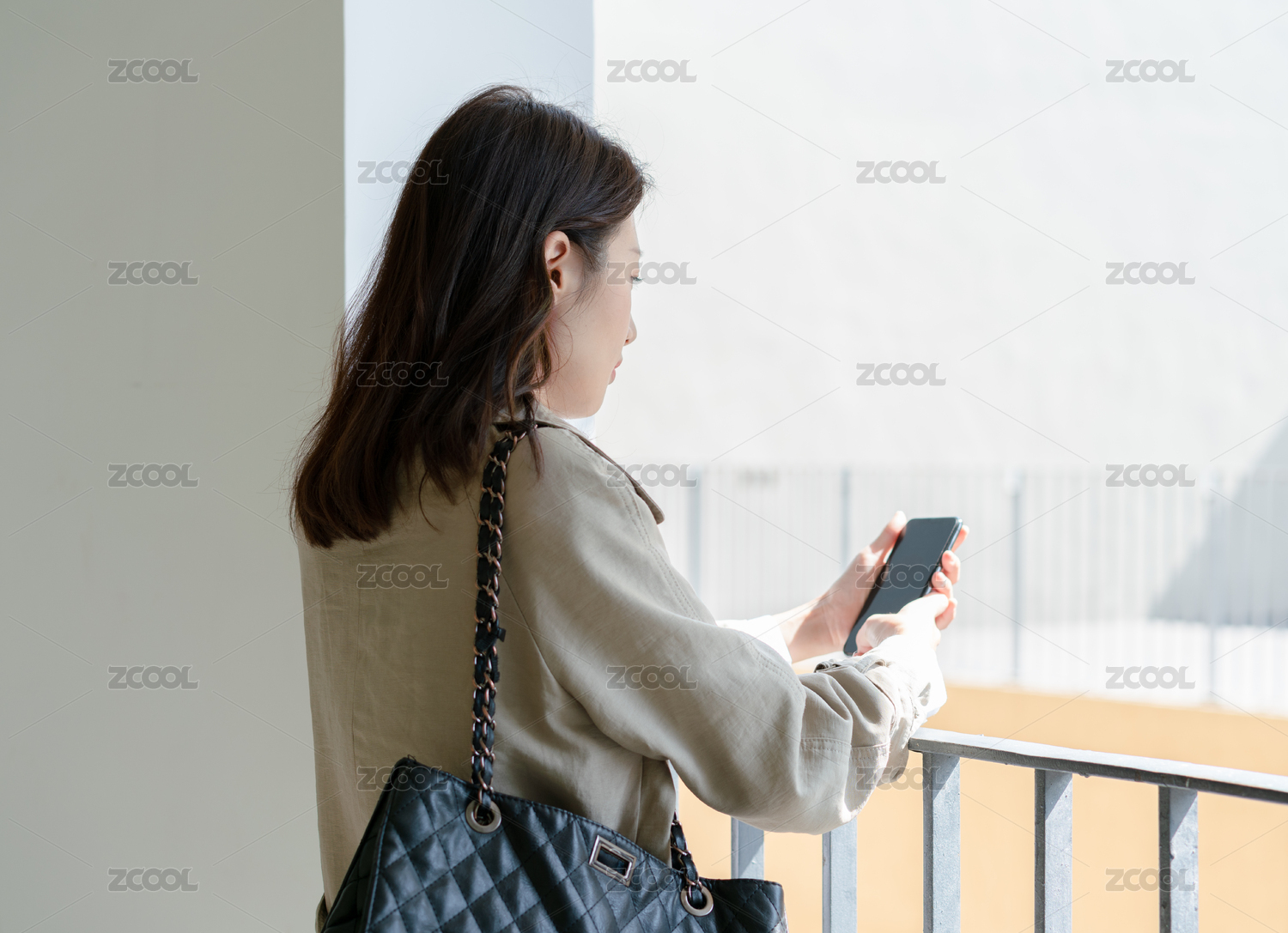 年轻亚洲商务人士靠着栏杆在看手机