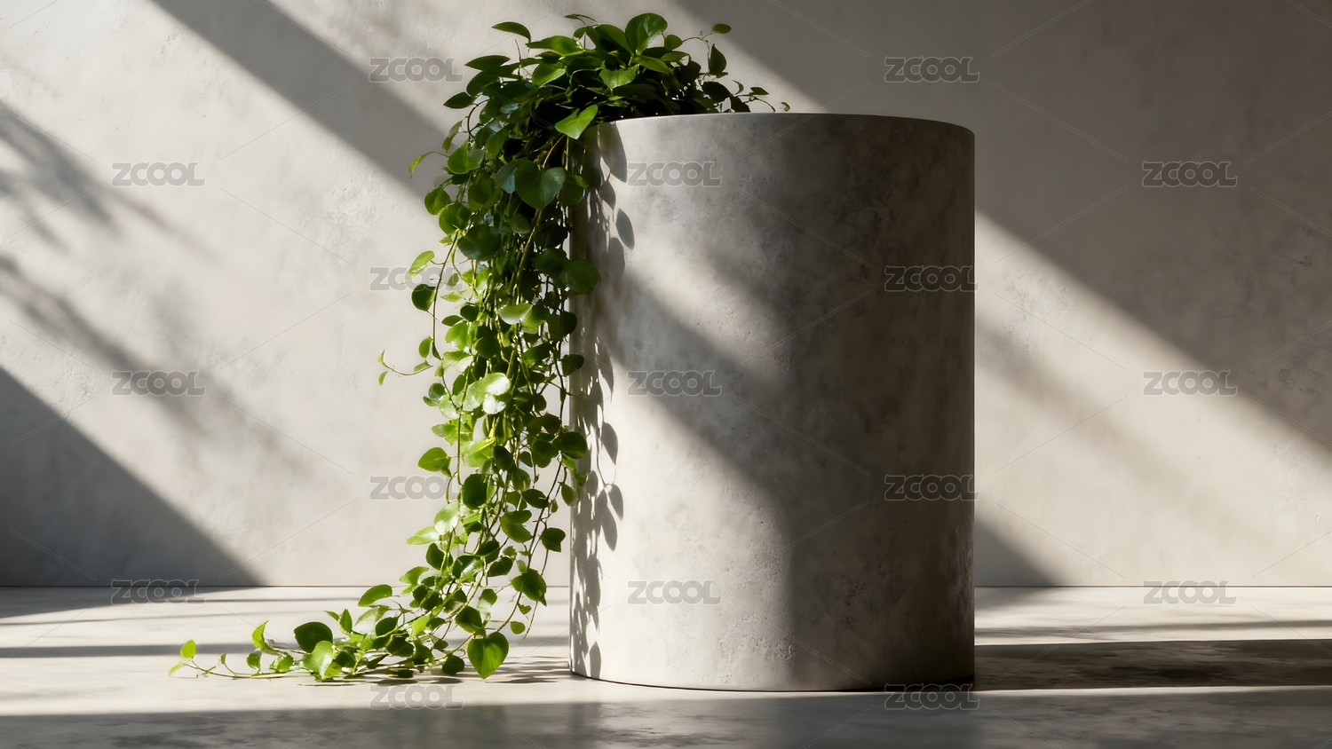 白色,圆形讲台,浅色木质地板,讲台,绿色植物,绿萝,常青藤类植物,浅色陶瓷,花盆,植物