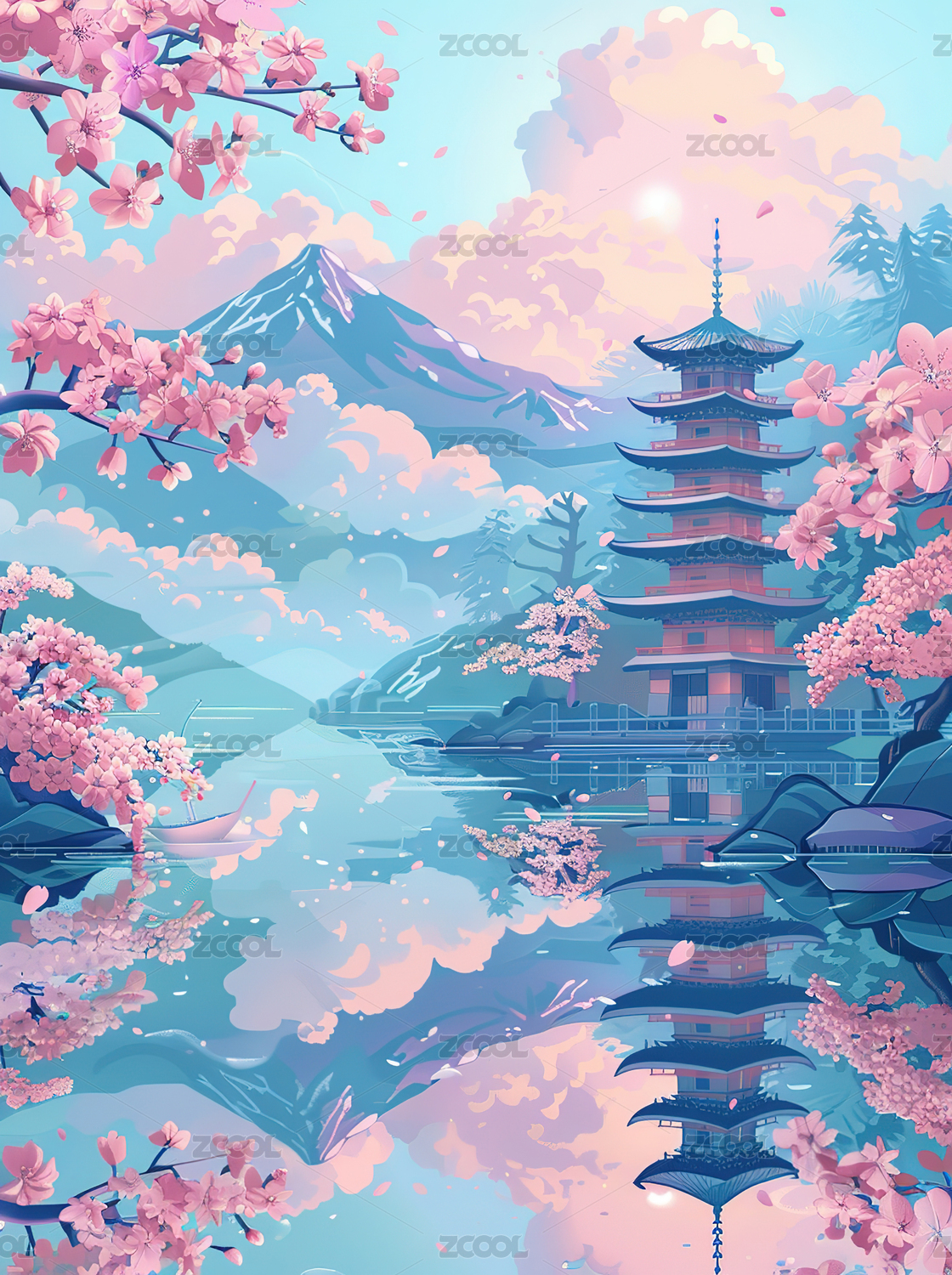 风景,宝塔,山腰,樱花,飘落,雪山,淡蓝,天空,自然