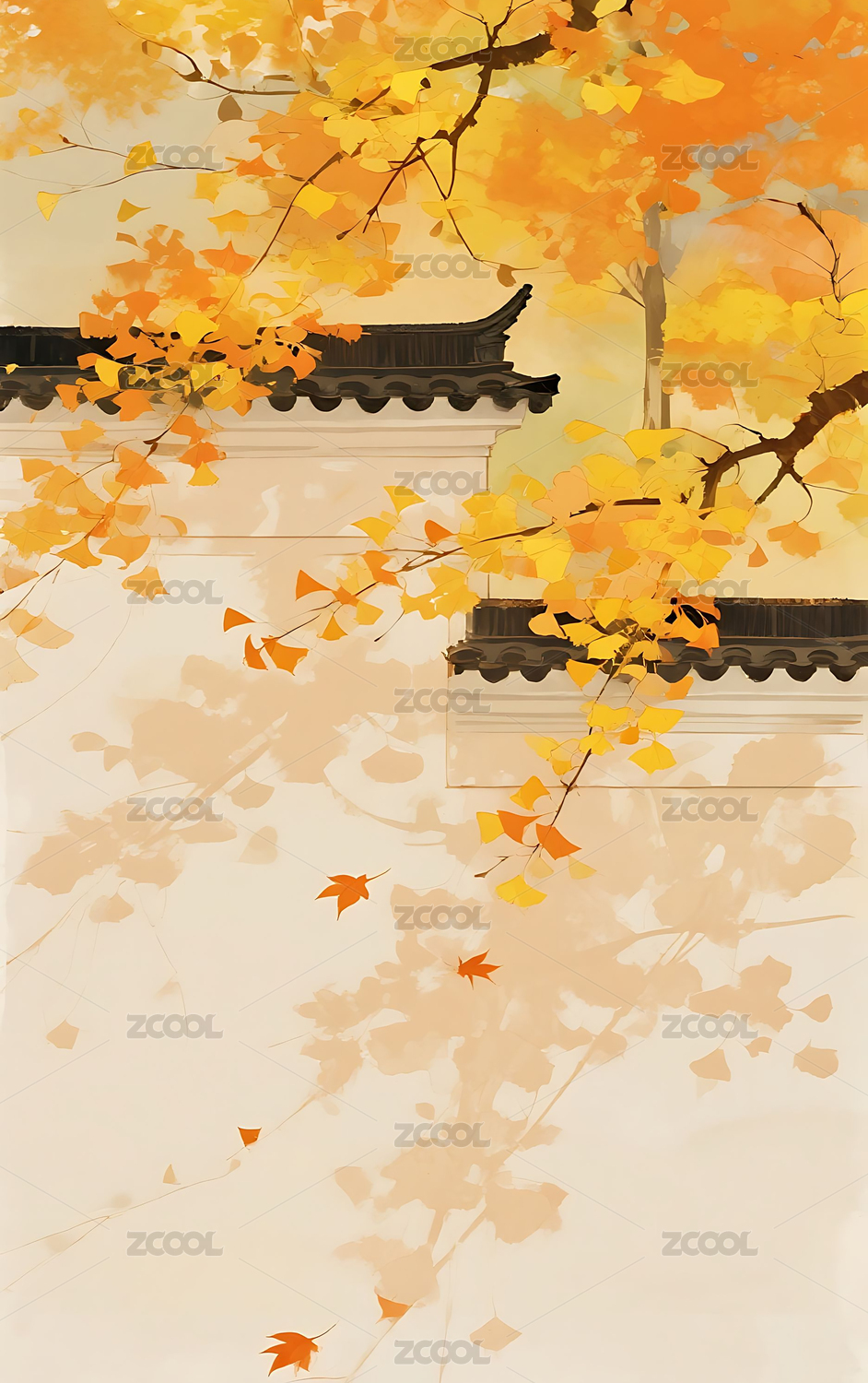 秋天氛围树下的古建筑插画背景壁纸