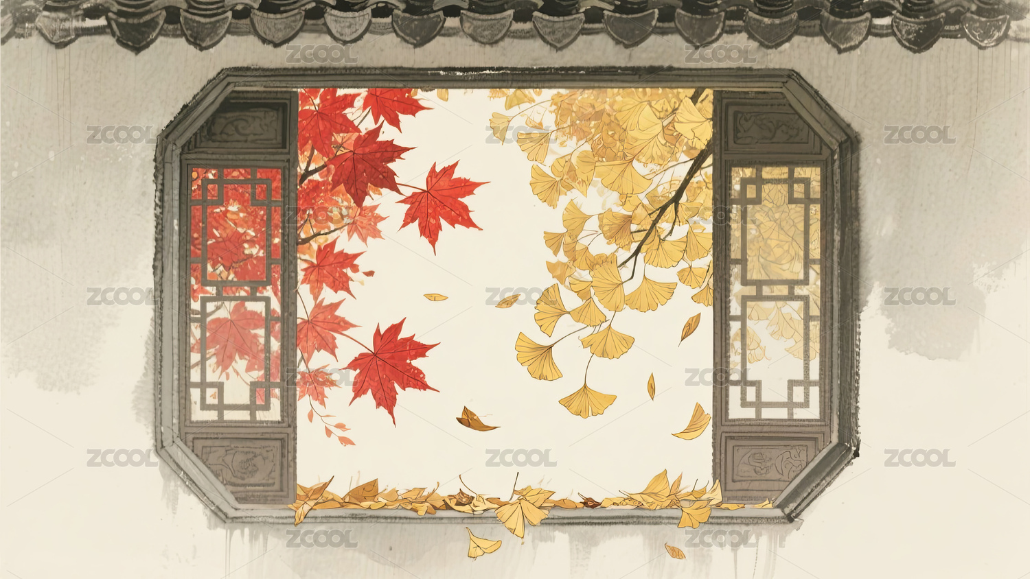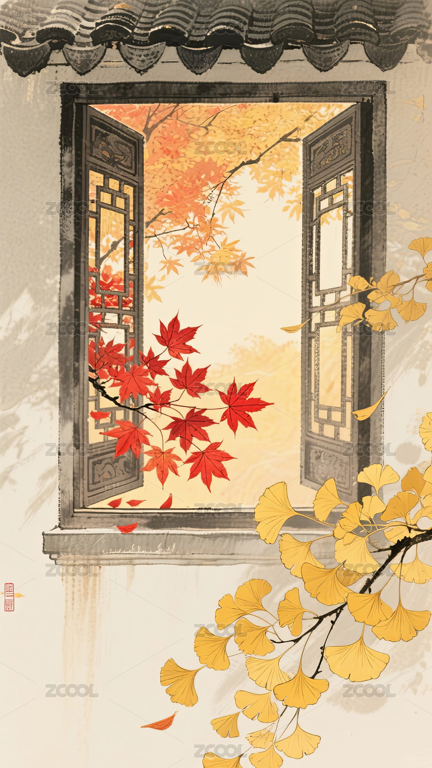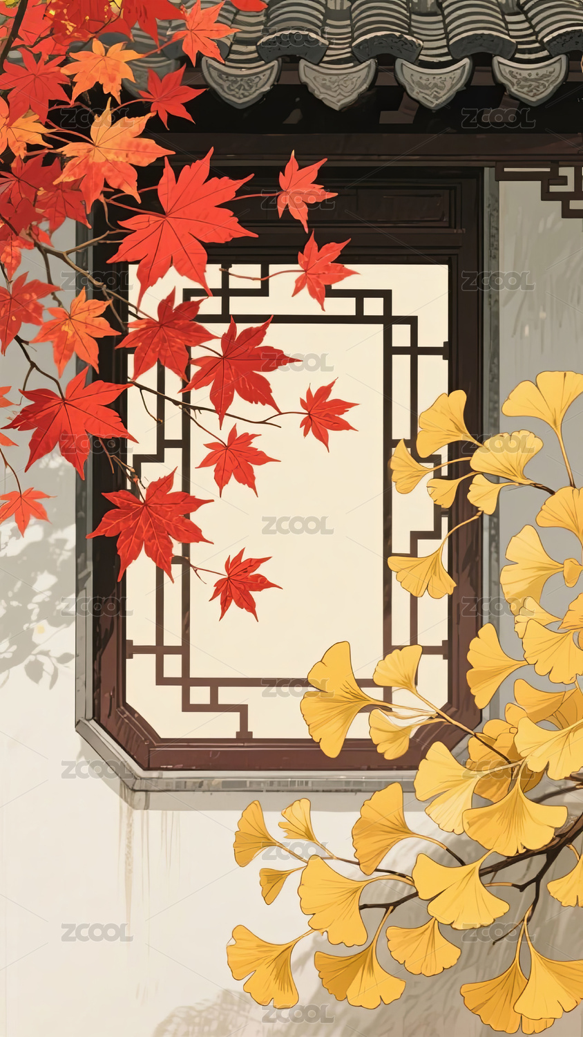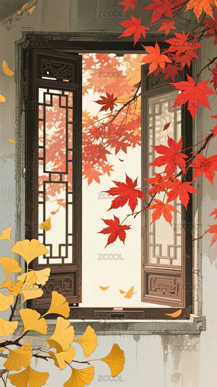 秋天古窗外的红枫和银杏